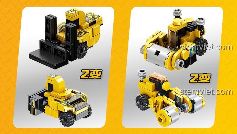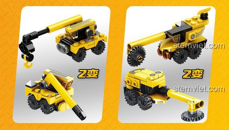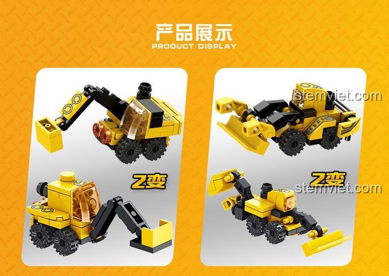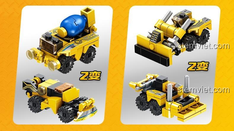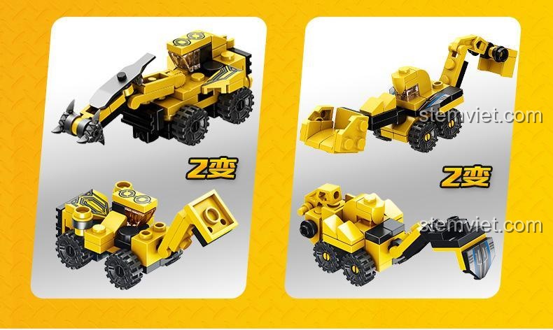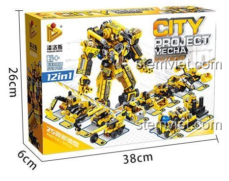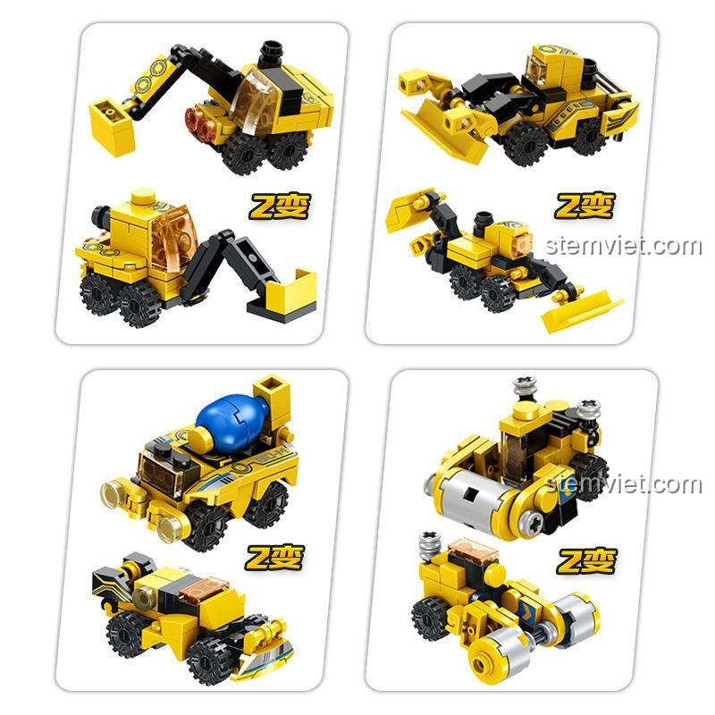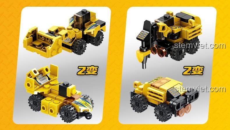 Chính xác! Bộ sản phẩm cho phép bạn lắp 12 xe công trình mini. Mỗi xe này lại có thể được biến đổi thành 1 dạng khác (tổng cộng 24 mô hình nhỏ). Cuối cùng, bạn có thể kết hợp cả 12 xe lại để tạo thành 1 Robot Mecha khổng lồ. Tổng cộng là 25 cách lắp ráp khác nhau.