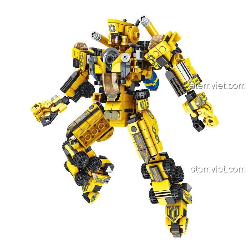Ngay từ cái nhìn đầu tiên, đồ chơi xếp hình Panlos Brick 633008 đã gây ấn tượng mạnh mẽ với tông màu vàng-đen chủ đạo, vừa khỏe khoắn, đặc trưng của các loại máy móc xây dựng, vừa mang lại vẻ ngoài hiện đại, ‘ngầu’ đúng chất robot chiến đấu. Bộ sản phẩm gồm 573 mảnh ghép, cho phép tạo ra 12 mẫu xe công trình mini khác nhau. Mỗi chiếc xe, từ xe xúc, xe ủi, xe lu đến xe cẩu, đều được thiết kế tỉ mỉ, mô phỏng chân thực các chi tiết như gàu múc, bánh xích, cần cẩu… Nhưng điều kỳ diệu chưa dừng lại ở đó! Khi hợp thể, chúng tạo nên một Robot Mecha Công Trình hoành tráng, với các khớp nối linh hoạt, dáng đứng vững chãi và những chi tiết máy móc phức tạp được thể hiện tinh xảo. Từng mảnh ghép đều được chăm chút kỹ lưỡng, tạo nên một tổng thể hài hòa, mạnh mẽ, chắc chắn sẽ là niềm tự hào của bé khi trưng bày trong góc học tập.