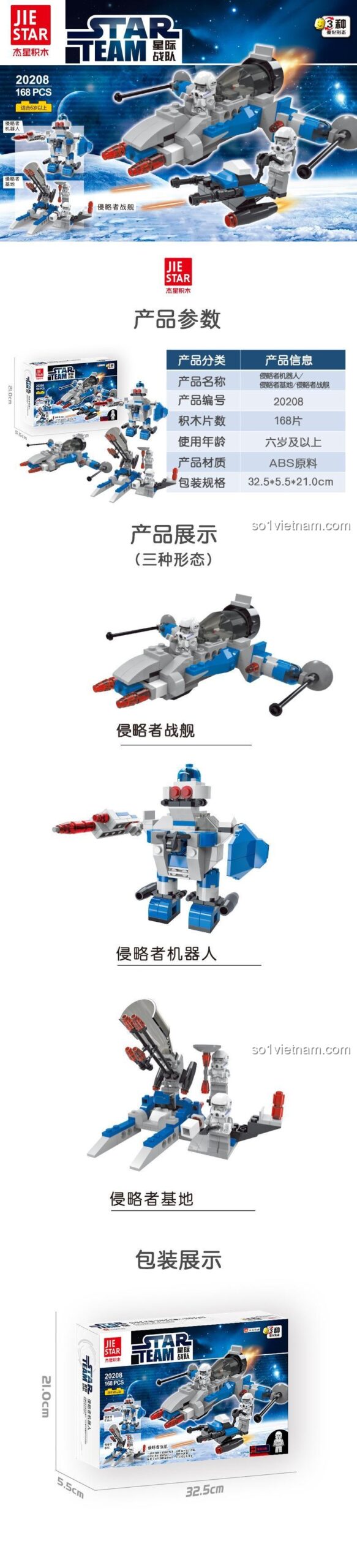 Còn gì tuyệt vời hơn khi thấy con trai mình reo lên sung sướng khi nhận được một món quà đúng sở thích? Bộ lắp ghép JIESTAR 20208 chính là phần thưởng xứng đáng cho bé sau những ngày học tập chăm chỉ, hay là món quà sinh nhật, quà Tết Thiếu Nhi 1/6 không thể tuyệt vời hơn. Đặc biệt, khi mua sản phẩm này tại Kho đồ chơi trẻ em, bé sẽ được tặng thêm các phụ kiện vũ khí độc đáo cho 2 minifigure đi kèm, giúp trận chiến ngân hà thêm phần gay cấn. Đừng bỏ lỡ cơ hội sở hữu một món đồ chơi 3 trong 1 đầy giá trị với mức giá cực kỳ ưu đãi!