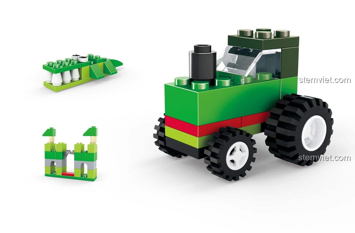 - Mô hình Lâu đài: Chỉ với vài bước thay đổi, chiếc máy kéo đã biến thành một tòa lâu đài mini kiên cố. Với những khối màu xám giả đá và tháp canh màu xanh, đây là nơi lý tưởng để các hiệp sĩ tí hon của bé trú ngụ và bảo vệ vương quốc.