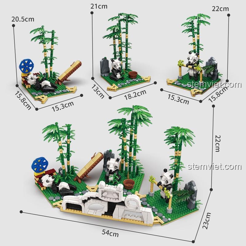 Điểm nhấn không thể bỏ qua chính là tạo hình của những chú gấu trúc. Không phải là những minifigure đơn điệu, mỗi chú gấu trúc trong bộ sản phẩm này đều được tạo nên từ nhiều mảnh ghép, mang những tư thế và biểu cảm khác nhau: có chú đang lười biếng nằm dài, có chú đang tinh nghịch trèo cây, có chú lại đang say sưa thưởng thức món măng non khoái khẩu. Sau khi hoàn thành, toàn bộ sa bàn có kích thước lên tới 54cm, một kích thước ấn tượng để trưng bày trong phòng của bé. Mỗi chi tiết nhỏ, từ chiếc cầu trượt, xích đu cho đến những tảng đá, đều được chăm chút kỹ lưỡng, tạo nên một đồ chơi mô hình KY2013 không chỉ đẹp mà còn có hồn.