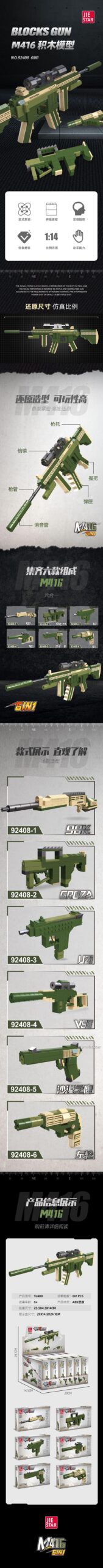 Điểm đặc biệt của bộ đồ chơi JIESTAR 92408 Súng M416 là bé có thể lắp ráp thành 6 mẫu súng quân sự khác nhau, bao gồm súng trường M416 và 5 mẫu súng khác như súng tiểu liên, súng lục, súng ngắn, súng trường, súng máy.