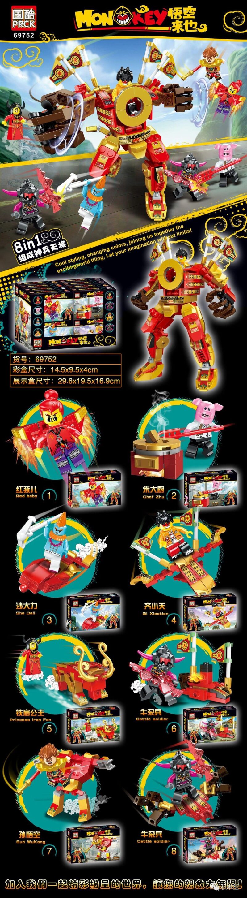 Bộ đồ chơi này có tổng cộng 9 mẫu lắp được! Bé có thể lắp ráp 8 mô hình nhân vật nhỏ riêng lẻ (Hồng Hài Nhi, Trư Bát Giới, Sa Ngộ Tĩnh, Tề Tiểu Thiên, Thiết Phiến Công Chúa, Ngưu Tạp Binh, Tôn Ngộ Không) và sau đó kết hợp tất cả thành 1 mô hình robot Thần Binh Thiên Tướng khổng lồ.