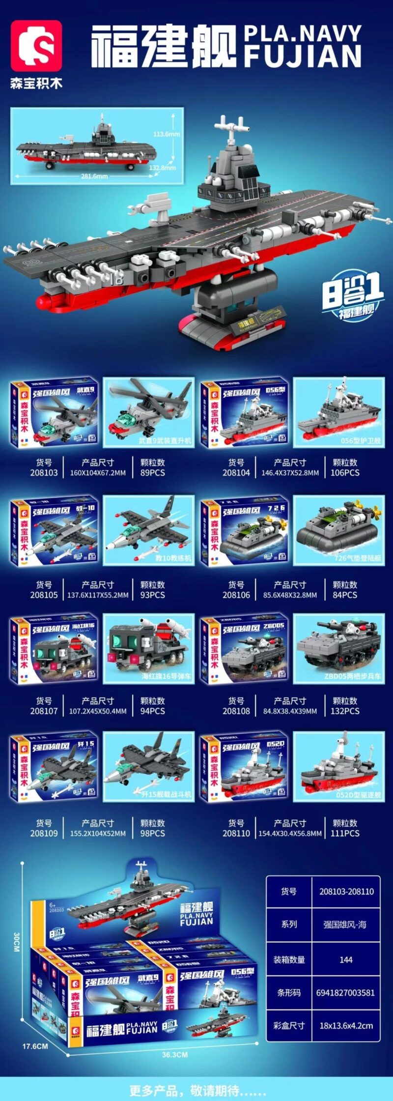 Và khi kết hợp sức mạnh của cả 8 mô hình, một siêu phẩm sẽ xuất hiện: Tàu sân bay Phúc Kiến khổng lồ và uy nghi. Với tông màu xám quân sự chủ đạo, điểm xuyết bằng các chi tiết đen và đỏ, mô hình tái hiện một cách chân thực đường băng, tháp chỉ huy, hệ thống vũ khí phòng thủ và các máy bay trên boong. Từng chi tiết nhỏ đều được chăm chút, mang lại một mô hình trực quan, sinh động, sẵn sàng cho mọi nhiệm vụ mà trí tưởng tượng của bé đặt ra.