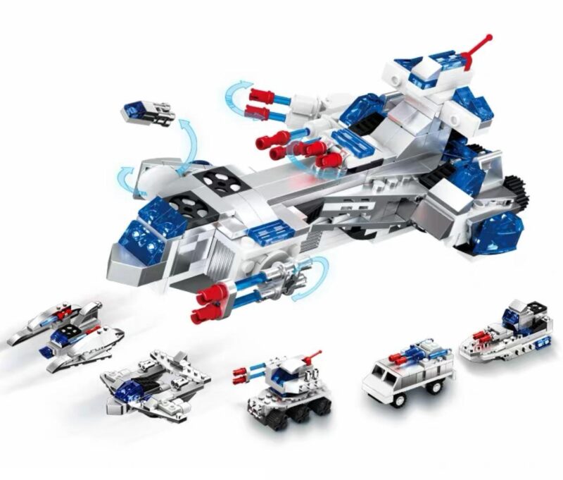 Điểm đặc biệt của đồ chơi lắp ráp Mô hình tàu chiến không gian là khả năng biến hình thành 6 mô hình phương tiện chiến đấu khác nhau từ cùng một bộ mảnh ghép. Bé có thể lắp ráp thành tàu khu trục lớn hoặc 6 mô hình nhỏ hơn như phi cơ, xe tăng, xe bọc thép, tàu tuần tra, phi thuyền trinh sát và drone chiến đấu, mang lại sự đa dạng trong trải nghiệm chơi.