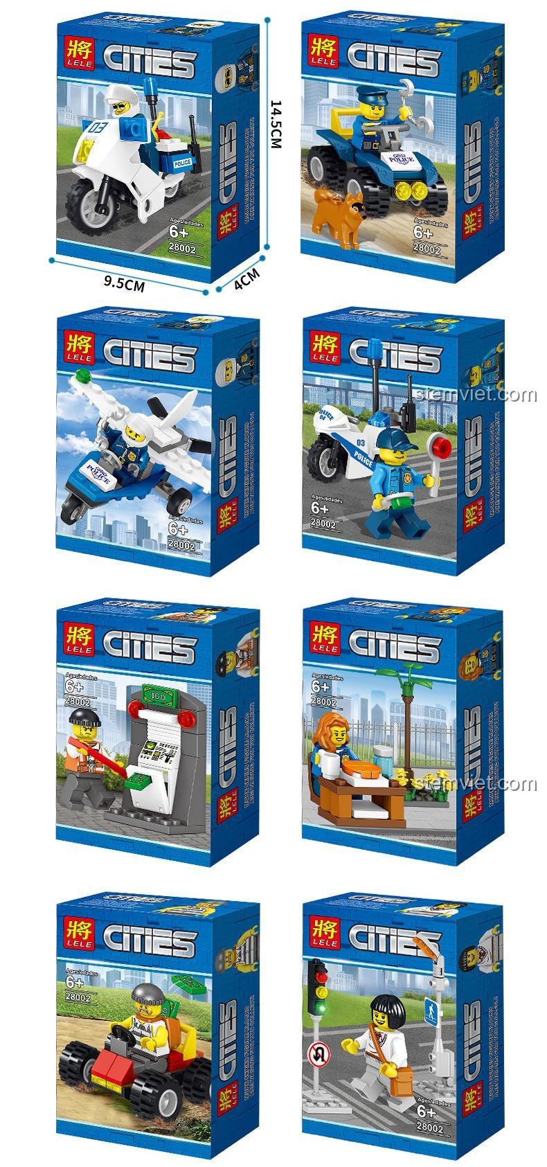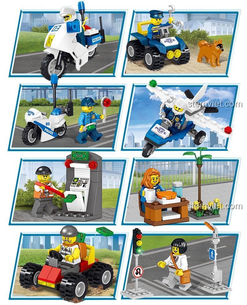 Dạ, bộ sản phẩm này là một bộ sưu tập đặc biệt, bao gồm 8 hộp nhỏ riêng biệt. Mỗi hộp là một mô hình hoàn chỉnh với một nhân vật (minifigure) và các phụ kiện đi kèm, tạo thành 8 cảnh chơi độc đáo trong chủ đề cảnh sát thành phố.