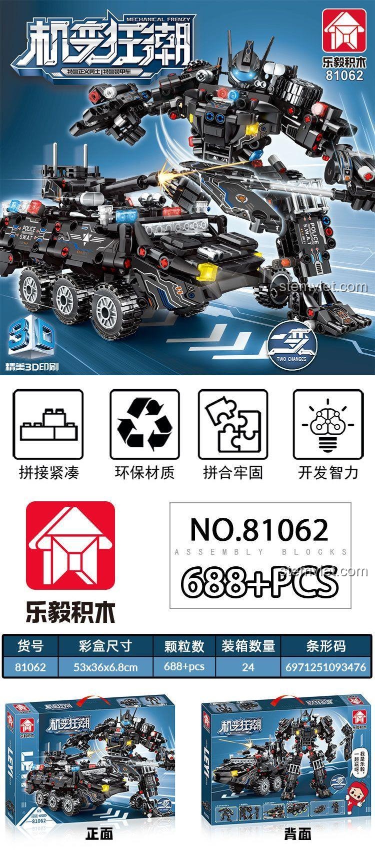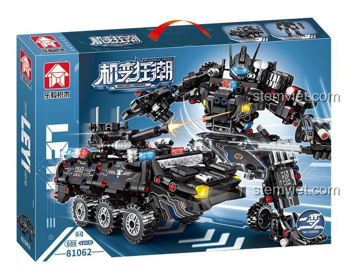 Sức hấp dẫn của bộ LeYi 81062 nằm ở thiết kế thông minh và đầy sáng tạo. Với 688 mảnh ghép, sản phẩm mang đến hai trải nghiệm hoàn toàn khác biệt. Ở dạng Robot, mô hình đứng sừng sững, oai phong với chiều cao ấn tượng, các khớp nối linh hoạt cho phép tạo nhiều tư thế chiến đấu dũng mãnh. Từng chi tiết từ vũ khí, giáp trụ đến phần đầu robot đều được chế tác tỉ mỉ, khoác lên mình tông màu Đen và Xám chủ đạo, toát lên vẻ mạnh mẽ, bí ẩn của một chiến binh đặc nhiệm. Khi cần di chuyển thần tốc, chỉ với vài bước biến đổi thông minh, Robot sẽ ‘biến hình’ thành chiếc Xe Bọc Thép SWAT 8 bánh hầm hố. Mô hình xe có kích thước 21 x 10 x 12 cm, thiết kế khí động học, trang bị pháo trên nóc và các chi tiết đèn báo hiệu, sẵn sàng cho mọi cuộc truy đuổi. Đây chính là một kiệt tác về kỹ thuật lắp ráp, một mô hình kép thỏa mãn cả hai đam mê của bé: robot và xe chiến đấu.