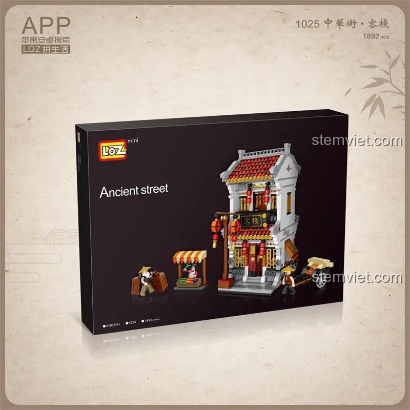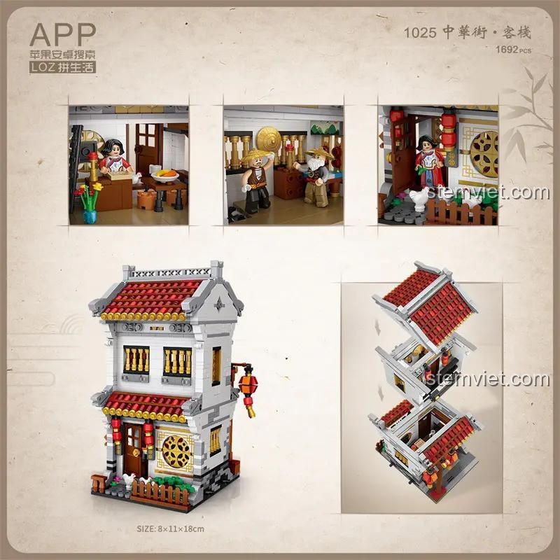 Vẻ đẹp của đồ chơi mô hình LOZ 1025 nằm ở sự chăm chút đến từng chi tiết nhỏ nhất. Mô hình cao 20cm, rộng 8cm và dài 11cm, một kích thước hoàn hảo để trưng bày trên bàn học hay kệ sách của bé. Tông màu chủ đạo Đỏ, Trắng, Xám được phối hợp hài hòa, tái hiện chân thực vẻ đẹp cổ kính của kiến trúc phương Đông. Mẹ và bé sẽ phải trầm trồ trước mái ngói âm dương cong vút, những khung cửa sổ mắt cáo tinh xảo, và đặc biệt là những chiếc đèn lồng đỏ treo cao mang biểu tượng của sự may mắn, tài lộc. Điểm nhấn không thể bỏ qua chính là tấm biển hiệu “客栈” (Khách Điếm) được thiết kế đầy nghệ thuật. Chưa dừng lại ở đó, bộ sản phẩm còn đi kèm 3 minifigures ngộ nghĩnh: một cô chủ quán hiếu khách, một người phu xe cần mẫn và một người khuân vác khỏe mạnh, cùng với quầy hàng rong và chiếc xe kéo tay, tất cả tạo nên một khung cảnh sinh hoạt đời thường vô cùng sống động và chân thực.