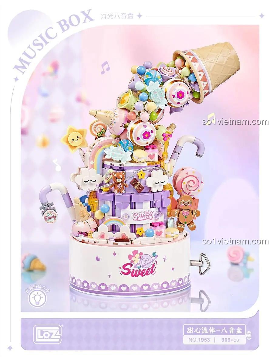 Bộ Lắp Ghép Hộp Nhạc Ngọt Ngào LOZ 1953 nổi bật với thiết kế vô cùng bắt mắt và chi tiết. Hình ảnh một chiếc kem ốc quế khổng lồ đang đổ xuống một thế giới đầy kẹo, bánh quy, cầu vồng và những đám mây bồng bềnh tạo nên một khung cảnh thần tiên, ngọt ngào. Mỗi chi tiết nhỏ như những viên kẹo đủ màu sắc, những chiếc bánh quy xinh xắn, hay những chú gấu teddy đáng yêu đều được tái hiện một cách tỉ mỉ, sống động. Sản phẩm sử dụng gam màu chủ đạo là hồng, trắng, vàng và tím, tạo nên một tổng thể hài hòa, tươi sáng và vô cùng nữ tính. Khi hoàn thành, mô hình không chỉ là một món đồ chơi mà còn là một vật trang trí tuyệt đẹp, tô điểm thêm cho góc học tập hay phòng ngủ của bé.