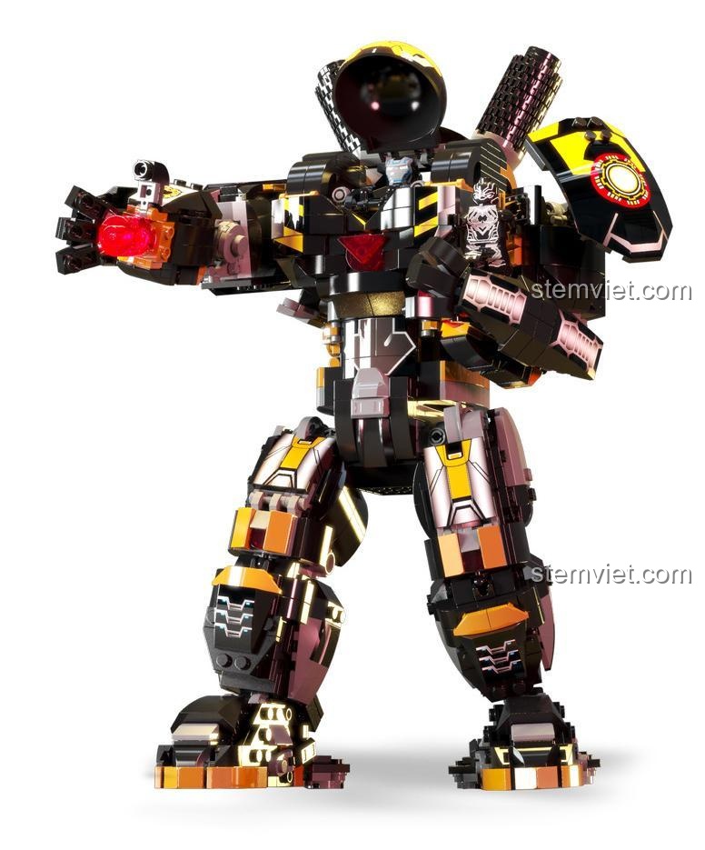 Khác biệt hoàn toàn với phiên bản màu đỏ-vàng quen thuộc, đồ chơi mô hình Hulkbuster phiên bản giới hạn mã 85006 khoác lên mình một bộ cánh mới: sự kết hợp đầy quyền lực giữa màu Đen huyền bí và Vàng hoàng kim (Black Gold). Lớp sơn đen tuyền mạnh mẽ, điểm xuyết bởi những chi tiết vàng óng ánh tạo nên một tổng thể vừa sang trọng, vừa toát lên vẻ bí ẩn và uy lực khó cưỡng. Từng đường nét trên bộ giáp được tái hiện một cách tỉ mỉ, từ những khớp nối cơ khí phức tạp, các tấm giáp góc cạnh cho đến lò phản ứng hồ quang ngay giữa ngực. Với chiều cao ấn tượng lên tới 31cm sau khi hoàn thành, mô hình này thực sự là một gã khổng lồ trong bất kỳ bộ sưu tập nào. Các chi tiết nhỏ như hệ thống tên lửa trên vai, các động cơ đẩy ở lưng và chân đều được chăm chút kỹ lưỡng, mang lại cảm giác chân thực như bước ra từ màn ảnh rộng. Đây không chỉ là một món đồ chơi, mà là một tác phẩm nghệ thuật cơ khí, một điểm nhấn đầy tự hào cho bất kỳ ai sở hữu.