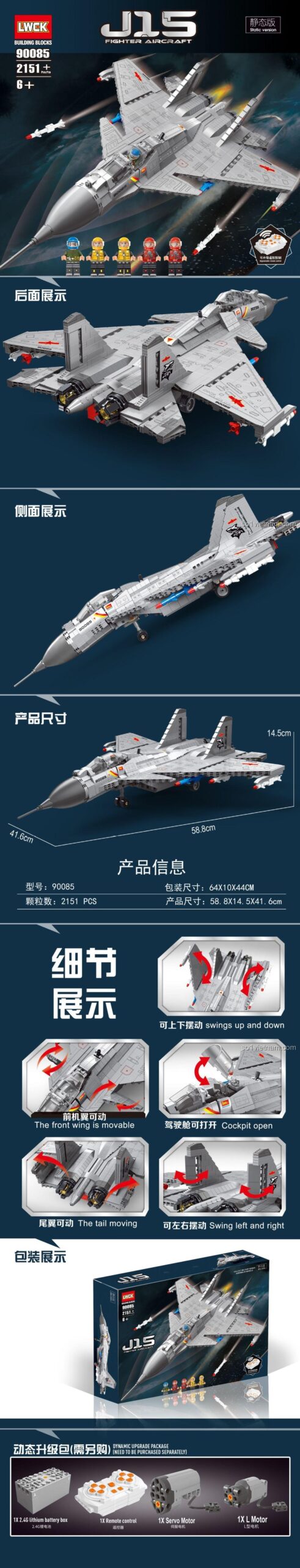 Bộ đồ chơi lắp ráp LWCK 90085 Máy bay chiến đấu J-15 là một kiệt tác về thiết kế, mang đến sự chân thực đến kinh ngạc. Với 2151 mảnh ghép, mỗi chi tiết đều được chăm chút tỉ mỉ, tái hiện hoàn hảo hình dáng mạnh mẽ và uy lực của chiến cơ J-15 ngoài đời thực. Màu sắc chủ đạo là xám bạc, tạo nên vẻ ngoài hiện đại và chuyên nghiệp, đúng chất một cỗ máy bay quân sự.