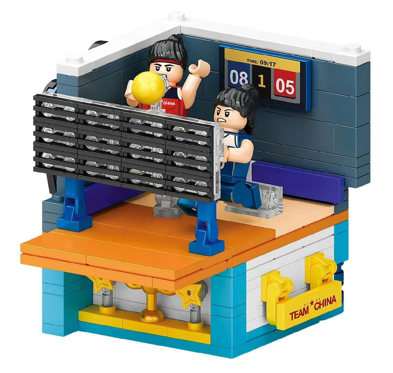 Nổi bật trên nền sân màu cam và xanh dương năng động là hai nữ vận động viên trong những tư thế thi đấu đầy quyết tâm. Một VĐV đang tung người thực hiện một cú đập bóng sấm sét, trong khi đồng đội ở tư thế phòng thủ, sẵn sàng cho mọi đường bóng. Từng chi tiết nhỏ như mái tóc búi cao gọn gàng, biểu cảm tập trung trên khuôn mặt, và trang phục thi đấu đều được thể hiện rất sinh động. Điểm nhấn đặc biệt là tấm lưới căng ngang sân và bảng điểm điện tử đang hiển thị tỉ số 08-05, gợi tả một khoảnh khắc gay cấn của trận đấu. Logo ‘TEAM CHINA’ khẳng định tinh thần đồng đội và nỗ lực vươn tới chiến thắng. Mọi thứ kết hợp lại tạo nên một mô hình tĩnh nhưng lại chứa đầy năng lượng và chuyển động, kích thích trí tưởng tượng của bé bay xa.