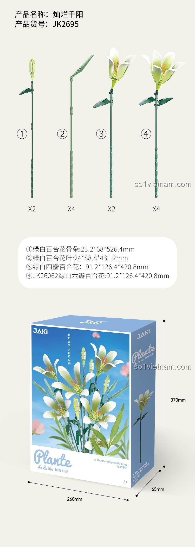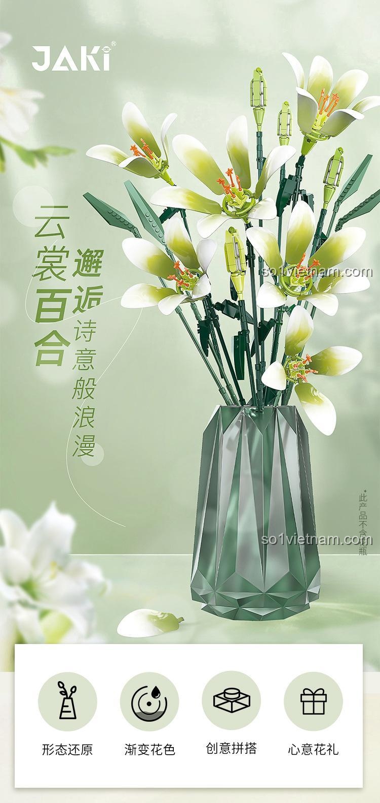 Chào mẹ, mẹ có biết không, đằng sau mỗi bông hoa ly không chỉ là vẻ đẹp kiêu sa, mà còn là cả một câu chuyện về sự thuần khiết, đức hạnh và những lời chúc tốt đẹp nhất. Lấy cảm hứng từ vẻ đẹp vượt thời gian đó và từ tên gọi “A Thousand Splendid Suns” (Ngàn mặt trời rực rỡ), JAKI đã tạo ra một tuyệt tác – bộ lắp ráp Bó hoa ly ngàn nắng. Đây không chỉ là một món đồ chơi, mà là một hành trình sáng tạo, nơi con gái yêu của mẹ có thể tự tay vun trồng nên một vườn hoa bất tử, một biểu tượng của vẻ đẹp vĩnh cửu sẽ mãi tô điểm cho góc học tập hay phòng ngủ của bé. Mỗi bông hoa được lắp ráp không chỉ là một mảnh ghép, mà còn là một lời chúc “mọi sự thuận lợi, vạn sự như ý”, một niềm hạnh phúc nhỏ bé mà mẹ và bé cùng nhau xây đắp. Hãy tưởng tượng niềm vui và sự tự hào trong ánh mắt con khi hoàn thành tác phẩm của riêng mình, một bó hoa không bao giờ tàn phai, cũng giống như tình yêu thương của mẹ vậy. Đây là cơ hội tuyệt vời để kể cho con nghe về ý nghĩa của các loài hoa, về sự kiên nhẫn và vẻ đẹp của sự sáng tạo.