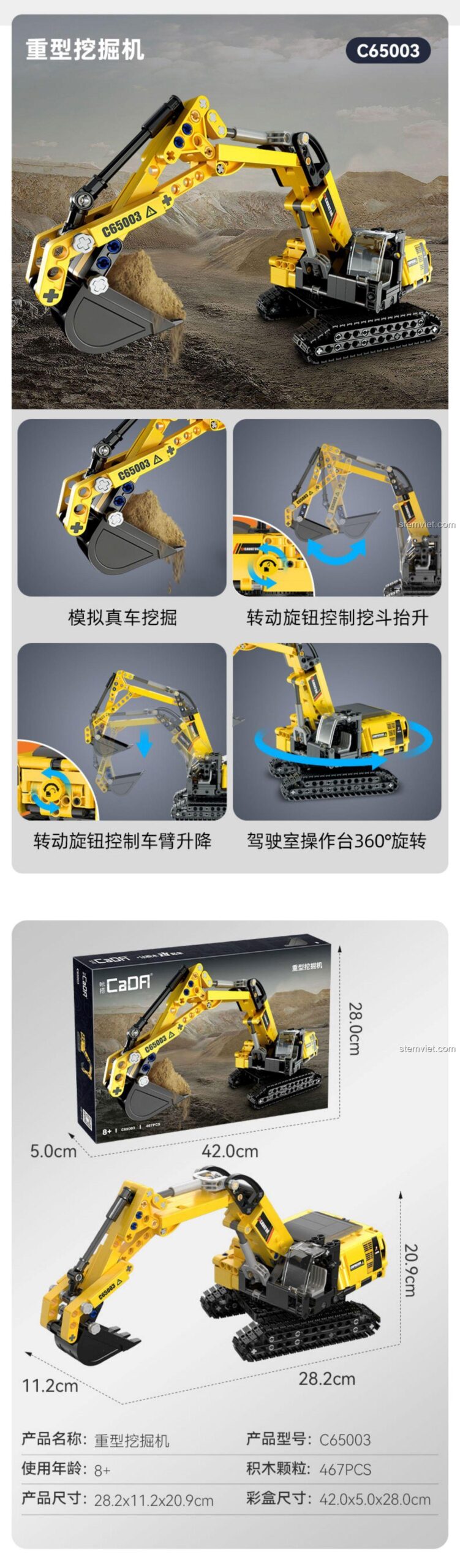 Bộ lắp ghép máy xúc hạng nặng CaDA C65003 bao gồm 467 chi tiết, mang đến một mô hình máy xúc chi tiết và ấn tượng.