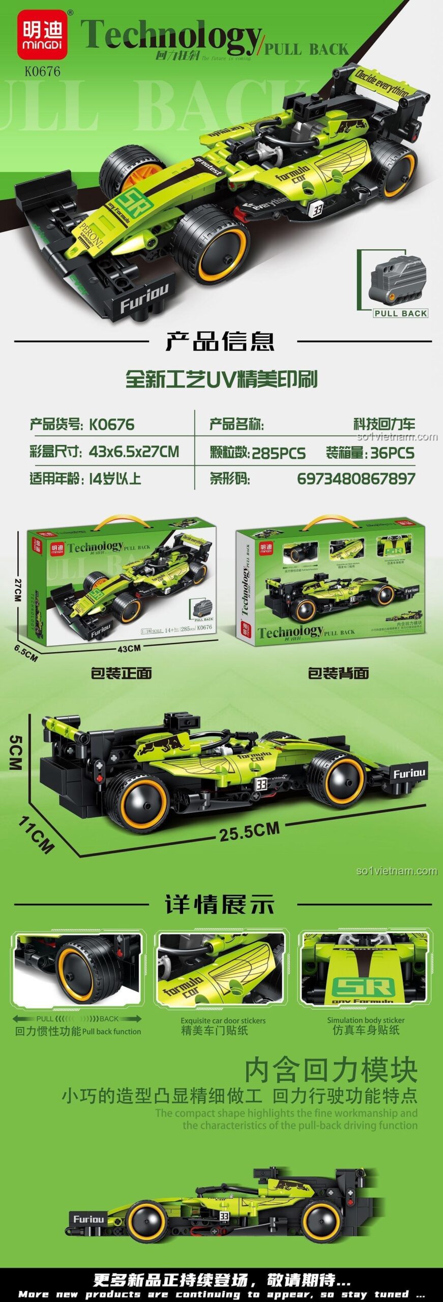 Với 285 mảnh ghép và hướng dẫn chi tiết, bộ lắp ghép Xe F1 Hồi Lực Mindi K0676 phù hợp cho các bạn từ 14 tuổi trở lên. Quá trình lắp ráp đòi hỏi sự kiên nhẫn và tỉ mỉ, nhưng hoàn toàn có thể chinh phục được.