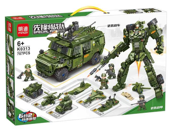 Bộ sản phẩm cho phép bé lắp ráp thành 8 mẫu khác nhau, bao gồm 6 mẫu xe quân sự nhỏ và 2 mẫu lớn là Xe Chiến Đấu Bọc Thép và Robot Biến Hình.