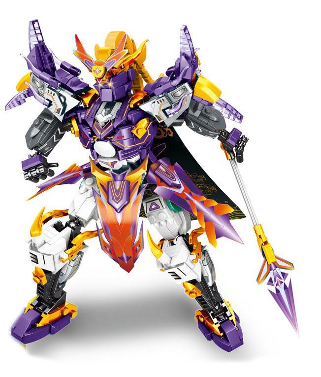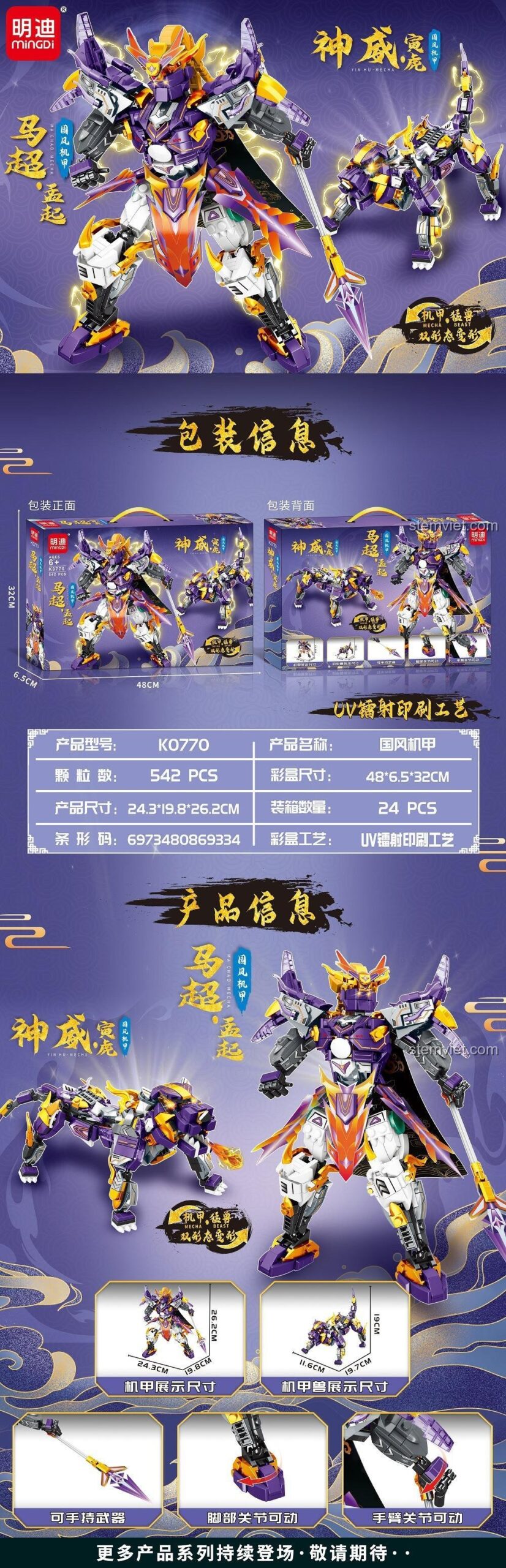 Ngay từ cái nhìn đầu tiên, bộ xếp hình Mingdi K0770 đã gây ấn tượng mạnh mẽ bởi thiết kế cực “ngầu” và tinh xảo. Khoác lên mình bộ giáp mang tông màu chủ đạo là tím huyền bí, vàng hoàng gia, trắng tinh khôi và đen mạnh mẽ, Robot Mã Siêu hiện lên như một chiến thần thực thụ. Từng chi tiết, từ chiếc mũ trụ có sừng, bộ giáp vai uy lực đến các khớp nối đều được chăm chút tỉ mỉ, tạo nên một tổng thể hài hòa và đầy sức mạnh. Với chiều cao ấn tượng 26.2 cm, mô hình có vóc dáng cân đối, vững chãi, sẵn sàng cho mọi tư thế chiến đấu. Đặc biệt hơn, từ 542 mảnh ghép, bé không chỉ tạo ra một robot, mà còn có thể “biến hình” thành một Thần Hổ dũng mãnh dài tới 25.7 cm, với dáng vẻ oai phong không kém. Cây giáo dài, vũ khí bất ly thân của Mã Siêu, cũng được tái hiện một cách sắc nét, hoàn thiện vẻ ngoài hoàn hảo cho vị tướng này.