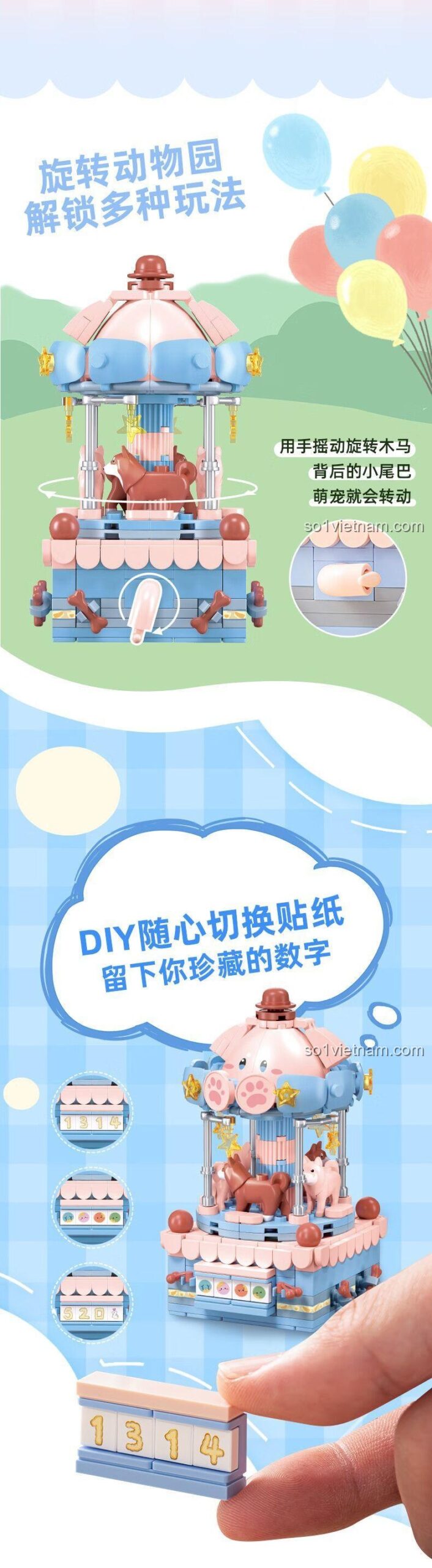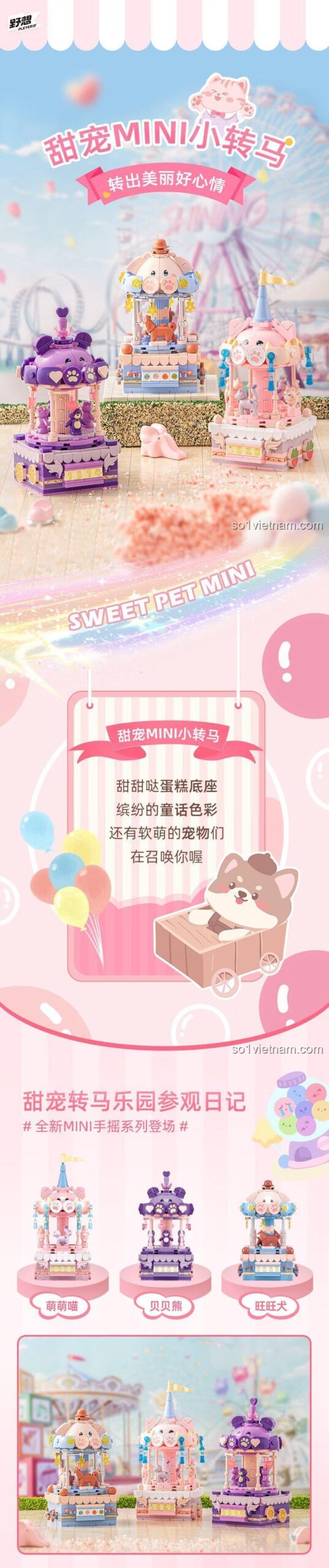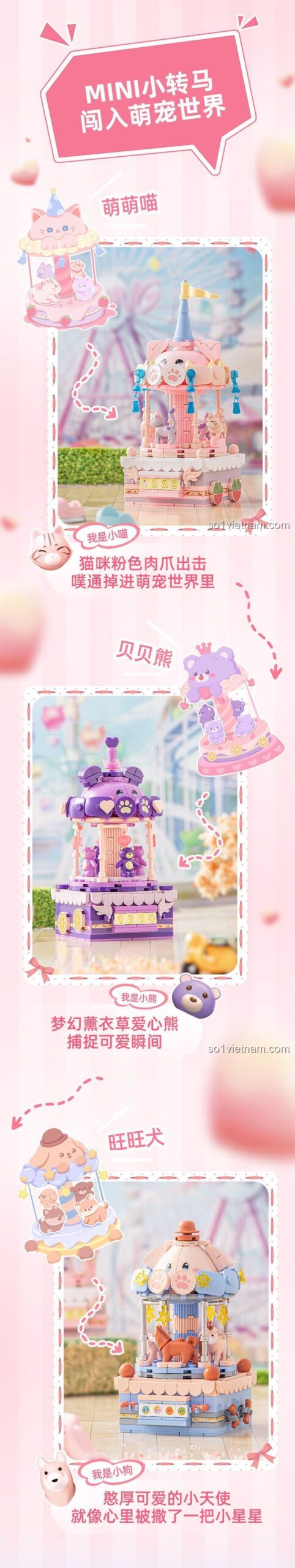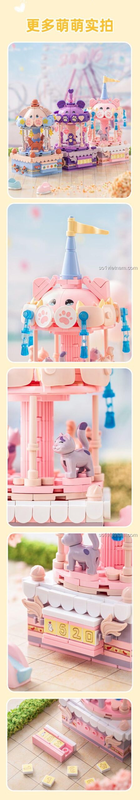 Bộ sản phẩm bao gồm 3 mẫu lắp ráp khác nhau: Ngựa Quay Ngọt Ngào, Mèo Hồng Dễ Thương và Gấu Trúc Xinh Xắn.