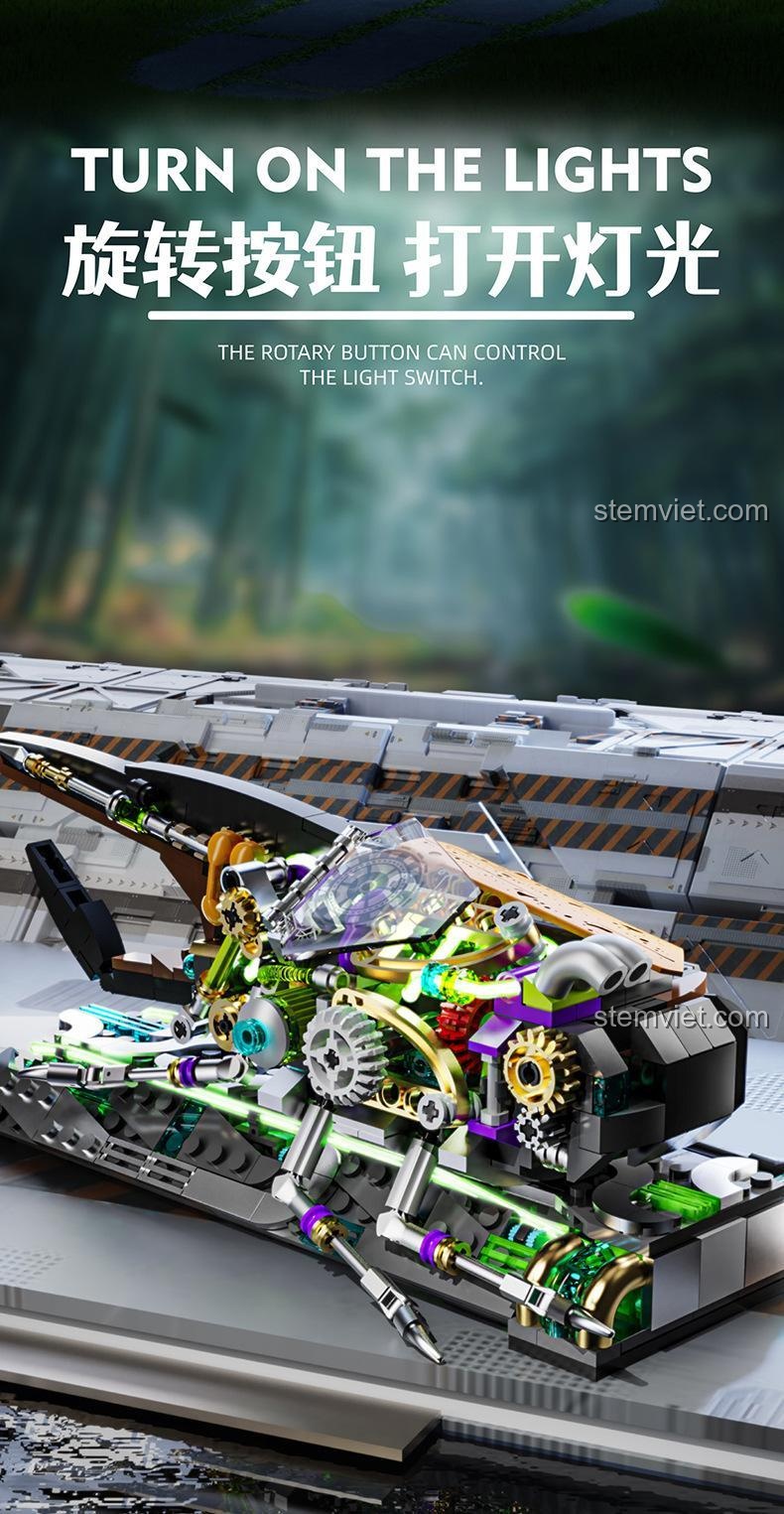 Bộ lắp ráp MJ 13053 không chỉ đẹp mà còn vô cùng sống động. Đây không phải là một mô hình tĩnh nhàm chán. Điểm nhấn ấn tượng nhất chính là các tính năng cơ khí tương tác. Đôi cánh của bọ hung có thể cử động linh hoạt, mô phỏng hành động chuẩn bị cất cánh đầy uy lực. Các khớp chân và càng cũng có thể điều chỉnh, cho phép bạn tạo ra nhiều tư thế khác nhau cho ‘chiến binh’ của mình. Đặc biệt, khi bạn xoay các bánh răng, bạn sẽ thấy các chi tiết máy móc bên trong chuyển động theo một chuỗi liên kết đẹp mắt, mang lại cảm giác như cỗ máy đang thực sự hoạt động. Chưa hết, điểm nhấn công nghệ cao của mô hình chính là hệ thống đèn LED tích hợp. Chỉ với một nút xoay, các đường ống năng lượng và ‘bộ não’ cơ khí sẽ bừng sáng, tạo ra một hiệu ứng thị giác cực kỳ ấn tượng, đặc biệt là trong điều kiện thiếu sáng. Tính năng này biến mô hình thành một vật trang trí độc đáo, một chiếc đèn ngủ cá tính cho căn phòng của bạn. Tất cả các chi tiết đều thuộc dạng Tương thích LEGO®, cho phép bạn thỏa sức sáng tạo và kết hợp với các bộ lắp ráp khác.
