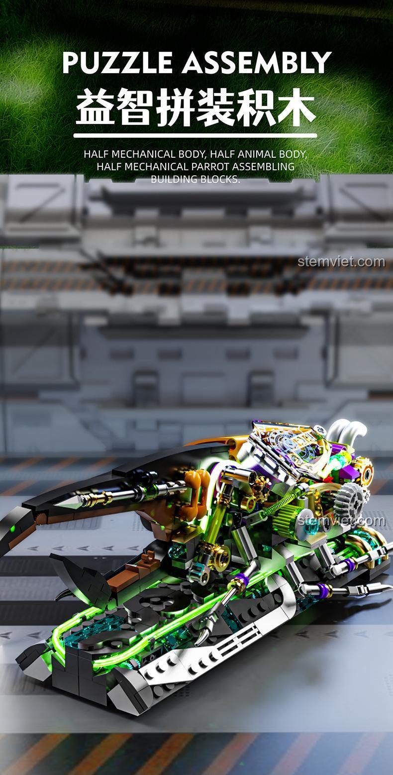 Ngay từ cái nhìn đầu tiên, Côn trùng cơ khí MJ đã gây ấn tượng mạnh mẽ bởi thiết kế nửa sinh học, nửa máy móc đầy táo bạo. Một bên thân giữ lại những đường nét cong mềm mại, hữu cơ của loài bọ cánh cứng, trong khi bên còn lại phô bày toàn bộ kết cấu cơ khí phức tạp bên trong. Sự kết hợp giữa các gam màu Đen, Xám mạnh mẽ với điểm nhấn Vàng, Tím và Xanh lá của các đường ống năng lượng tạo nên một tổng thể hài hòa nhưng cũng đầy kịch tính. Với kích thước ấn tượng 28x8x10 cm sau khi hoàn thành, mô hình này đủ lớn để trở thành tâm điểm trên bàn học hay kệ trưng bày của bạn. Các chi tiết được chăm chút tỉ mỉ, từ những bánh răng nhỏ li ti, lò xo, piston cho đến lớp vỏ giáp vàng óng với họa tiết giả kim loại bị ăn mòn, tất cả đều góp phần tạo nên một vẻ ngoài steampunk chân thực. Điểm đặc biệt nhất chính là phần đầu và cánh, nơi các chi tiết máy móc được thể hiện rõ nét, như thể bạn đang nhìn xuyên qua lớp vỏ để thấy được cỗ máy đang vận hành bên trong. Đây thực sự là một tác phẩm nghệ thuật cơ khí, một minh chứng cho sự sáng tạo không giới hạn.