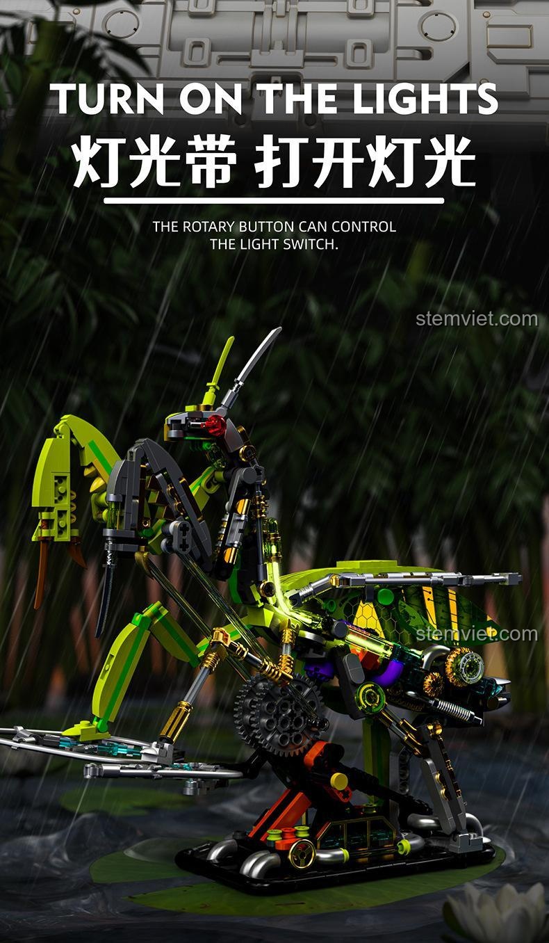 Điểm nhấn nổi bật nhất chính là hệ thống đèn LED tích hợp. Chỉ với một nút xoay, bạn có thể bật đèn, làm đôi mắt đỏ của bọ ngựa và các chi tiết máy móc bên trong phát sáng rực rỡ. Trong bóng tối, mô hình trở nên cực kỳ ấn tượng và huyền bí, như một sinh vật cơ khí bước ra từ thế giới khoa học viễn tưởng. Tính năng này không chỉ tăng thêm vẻ đẹp cho mô hình mà còn khơi gợi trí tưởng tượng về những cuộc săn đêm của cỗ máy.