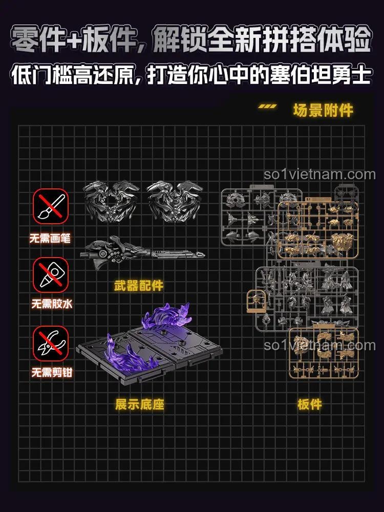 Đồ chơi mô hình 71158 không chỉ là một mô hình tĩnh mà còn là một chiến binh đầy sức sống với hàng loạt tính năng ấn tượng. Điểm nổi bật nhất chính là khả năng toàn thân khớp nối linh hoạt, cho phép Megatron thực hiện mọi tư thế chiến đấu, từ những cú đấm uy lực đến những pha né tránh nhanh nhẹn. Bé có thể thỏa sức sáng tạo, tái hiện lại những trận chiến kinh điển trong phim hoặc tự mình dàn dựng những cuộc đối đầu mới mẻ. Đặc biệt, mắt và ngực của Megatron được trang bị đèn LED, có thể phát sáng rực rỡ, tạo hiệu ứng thị giác sống động, làm tăng thêm sự chân thực và kịch tính cho mỗi màn trình diễn. Tính năng này biến Megatron từ một mô hình đơn thuần thành một nhân vật sống động, sẵn sàng lao vào trận chiến. Bộ sản phẩm còn đi kèm với vũ khí đặc trưng của Megatron – pháo năng lượng, cùng một đế trưng bày vững chắc, giúp mô hình luôn đứng vững và nổi bật. Điều thú vị là, mô hình lắp ráp BLOKEES 71158 được thiết kế để lắp ráp dễ dàng mà không cần đến các dụng cụ phức tạp như sơn, keo hay kìm cắt, giúp bé tự tay hoàn thành tác phẩm của mình một cách nhanh chóng và an toàn. Đây là một trải nghiệm lắp ráp thú vị, phù hợp với độ tuổi 12+, giúp bé rèn luyện sự khéo léo và kiên nhẫn.