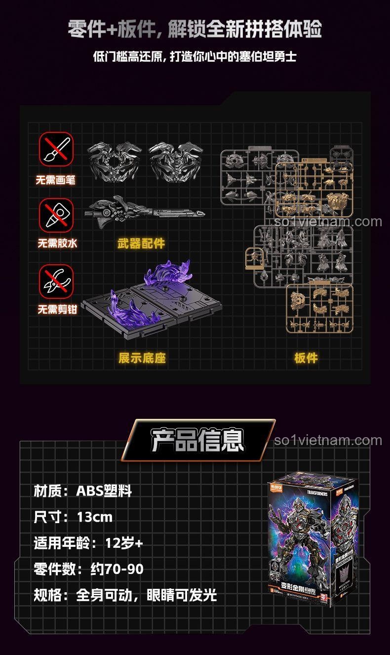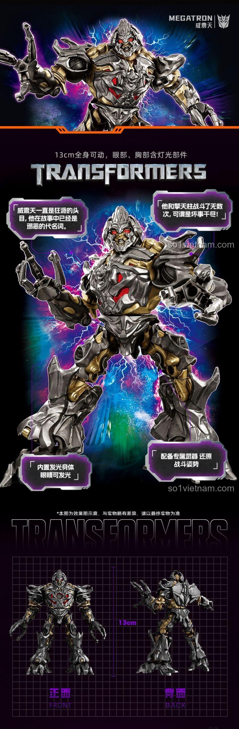 Điểm nổi bật của mô hình lắp ráp Transformers Megatron là mắt và ngực có đèn LED phát sáng, cùng toàn thân khớp nối linh hoạt cho phép tạo nhiều tư thế. Sản phẩm còn đi kèm vũ khí và đế trưng bày, tăng thêm giá trị chơi và trưng bày.