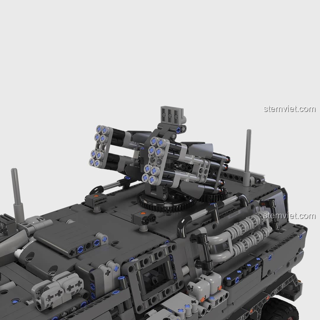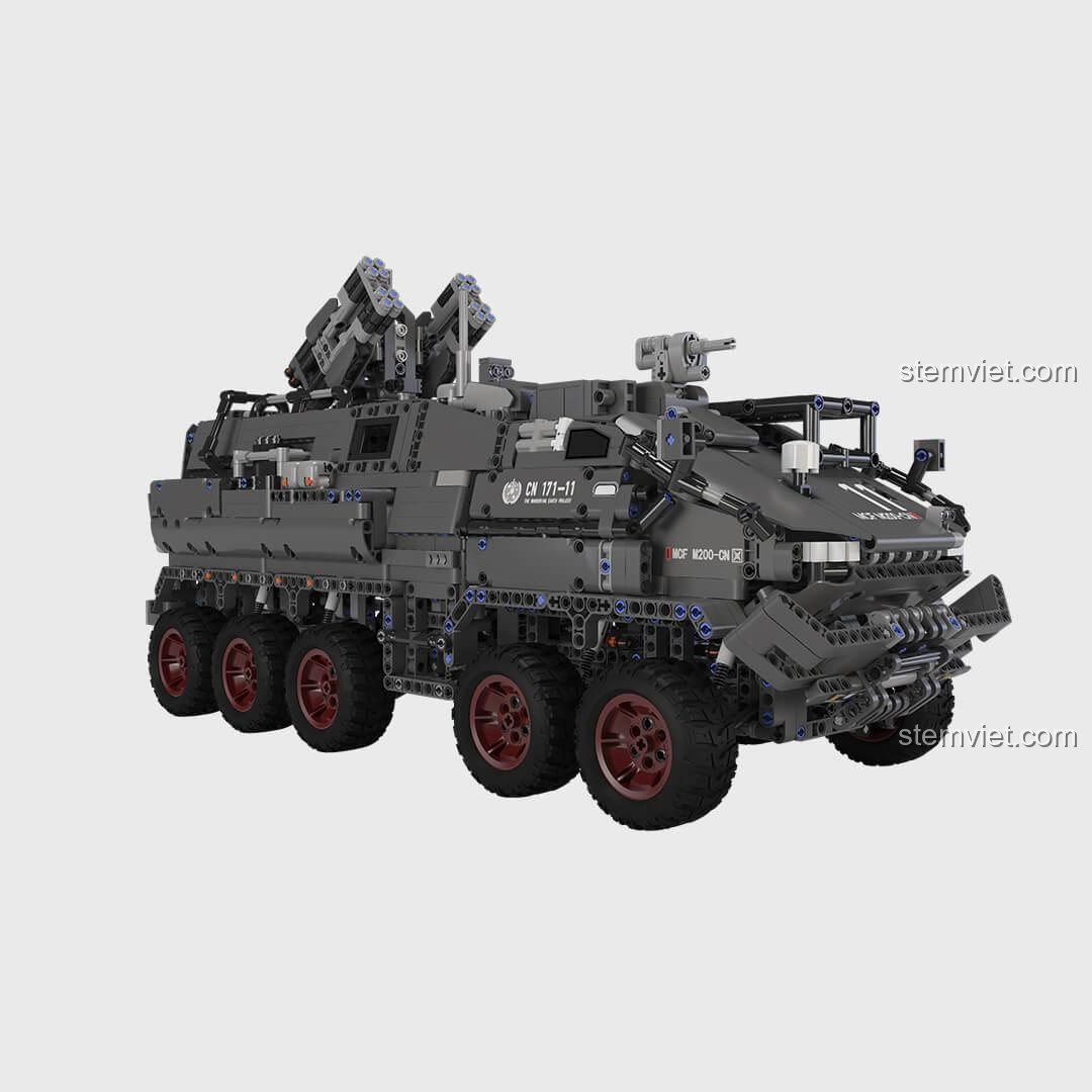 Bộ lắp ráp Xe Vận Chuyển Quân Sự CN171-11 Lưu Lạc Địa Cầu ONEBOT OBLDQ16AIQI không chỉ gây ấn tượng bởi vẻ ngoài hầm hố mà còn bởi những tính năng cơ khí độc đáo, mang đến trải nghiệm chơi cực kỳ sống động. Điểm nhấn nổi bật nhất chính là hệ thống treo 10 bánh độc lập, giúp chiếc xe bọc thép CN171-11 này có khả năng vượt địa hình cực tốt, mô phỏng chân thực chuyển động của một phương tiện quân sự hạng nặng. Con trai bạn sẽ thích thú khi thấy từng bánh xe di chuyển linh hoạt, hấp thụ chấn động một cách mượt mà. Tháp pháo trên nóc xe có thể xoay 360 độ và nâng hạ nòng súng, cho phép người chơi mô phỏng các pha chiến đấu và phòng thủ đầy kịch tính. Đặc biệt, các cửa bên và cửa đuôi xe đều có thể mở ra, hé lộ không gian bên trong, tăng cường khả năng nhập vai và sáng tạo câu chuyện. Mặc dù là mô hình tĩnh, bộ đồ chơi mô hình ONEBOT này được thiết kế để có thể nâng cấp với động cơ pin (cần mua thêm), mở ra khả năng điều khiển từ xa, biến chiếc xe thành một cỗ máy chiến đấu thực sự. Đây là một bộ lắp ráp OBLDQ1DQ16AIQI hoàn hảo cho những ai yêu thích kỹ thuật và muốn khám phá sâu hơn về cơ chế hoạt động của các phương tiện quân sự.