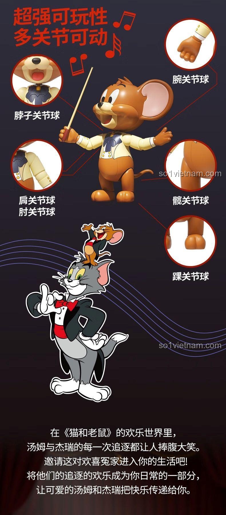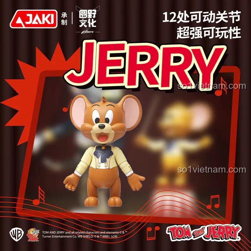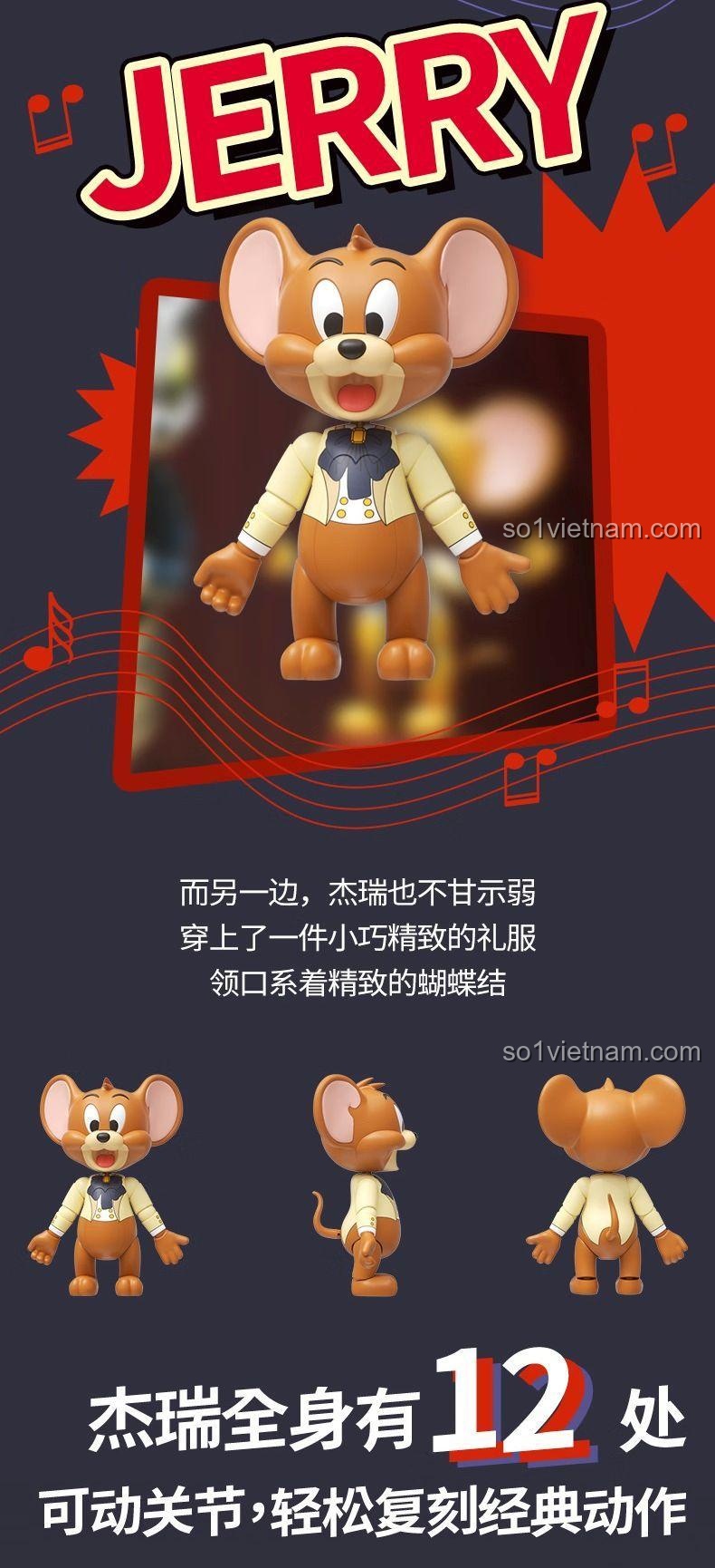 - Mô hình Jerry: Cao 10.8cm, với bộ vest vàng và nơ bướm xanh, trông vô cùng tinh nghịch và đáng yêu.
