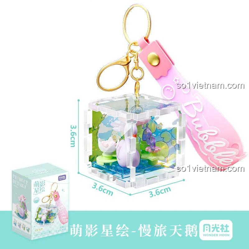 Mỗi mảnh ghép của đồ chơi mô hình 802065 đều được chế tác tỉ mỉ để tạo nên một tác phẩm nghệ thuật thu nhỏ. Thiết kế dạng khối lập phương trong suốt không chỉ bảo vệ mô hình thiên nga bên trong mà còn tạo hiệu ứng thị giác độc đáo, như một thế giới nhỏ bé được gói gọn trong lòng bàn tay. Màu sắc chủ đạo là hồng dịu dàng, trắng tinh khôi, xanh dương trong trẻo và xanh lá tươi mát, tạo nên một khung cảnh hài hòa và bắt mắt. Với kích thước nhỏ gọn chỉ 3.6 x 3.6 x 3.6 cm, móc khóa Thiên Nga Du Ngoạn Wonder Moon này là phụ kiện hoàn hảo để trang trí túi xách, chìa khóa hay bất cứ vật dụng cá nhân nào, thể hiện phong cách Thiên Nga Tinh Tế của người sở hữu. Từng chi tiết nhỏ, từ hình dáng thiên nga đến cảnh quan xung quanh, đều được chăm chút, mang đến một vẻ đẹp tinh xảo và cuốn hút.