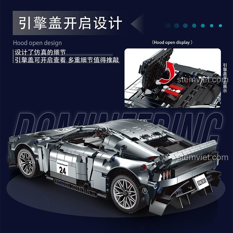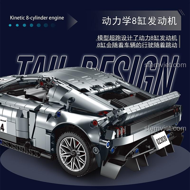 Đồ chơi mô hình 23030 nổi bật với vô lăng liên kết bánh xe, động cơ V8 động học có thể chuyển động, nắp capo và cửa xe có thể mở được. Những tính năng này mang lại trải nghiệm chơi chân thực và tương tác cao, giúp bé khám phá cơ chế hoạt động của siêu xe.