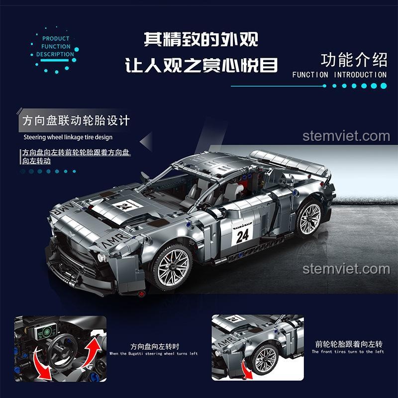 Bộ lắp ráp MORKMODEL 023030-3 Aston Martin Victor không chỉ dừng lại ở vẻ ngoài ấn tượng mà còn sở hữu những tính năng cơ khí độc đáo, mang đến trải nghiệm chơi chân thực và sống động. Điểm nhấn đầu tiên phải kể đến là hệ thống bánh lái liên kết với bánh xe. Khi bạn xoay vô lăng, bánh xe phía trước sẽ chuyển động theo, mô phỏng chân thực cơ chế lái của một chiếc xe thật. Điều này không chỉ tăng tính tương tác mà còn giúp bé hiểu hơn về nguyên lý hoạt động của hệ thống lái.