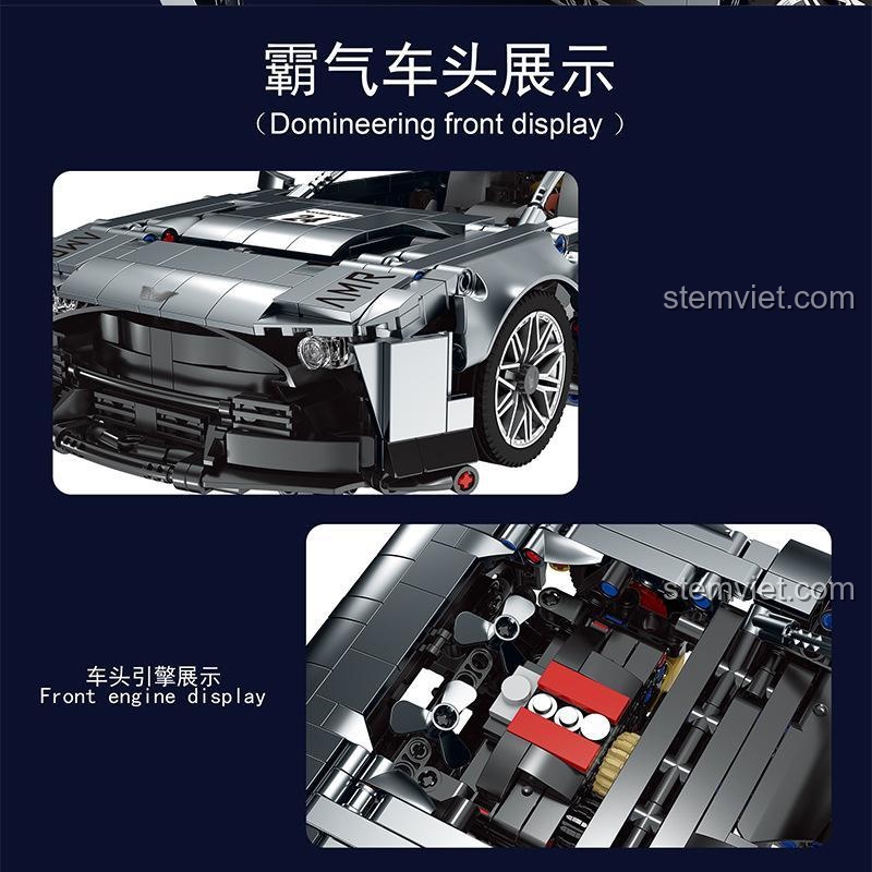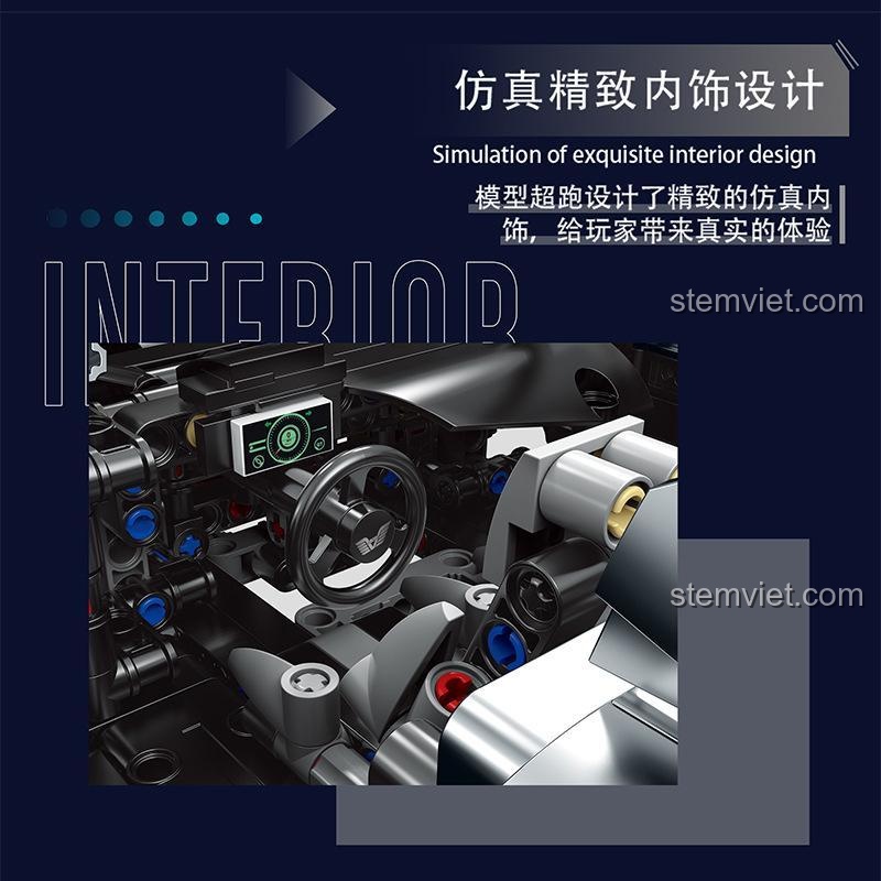 Bạn sẽ kinh ngạc trước sự chính xác của các chi tiết như đèn pha sắc sảo, lưới tản nhiệt mạnh mẽ, và cánh gió sau khí động học. Đặc biệt, nội thất bên trong xe cũng được mô phỏng chân thực đến không ngờ, từ buồng lái, ghế ngồi cho đến vô lăng, mang lại cảm giác như đang chiêm ngưỡng một chiếc Aston Martin Victor thu nhỏ thực sự. Đây là một đồ chơi xây dựng không chỉ đẹp mắt mà còn khơi gợi niềm đam mê về kỹ thuật và thiết kế ô tô cho các bé trai và cả người lớn.