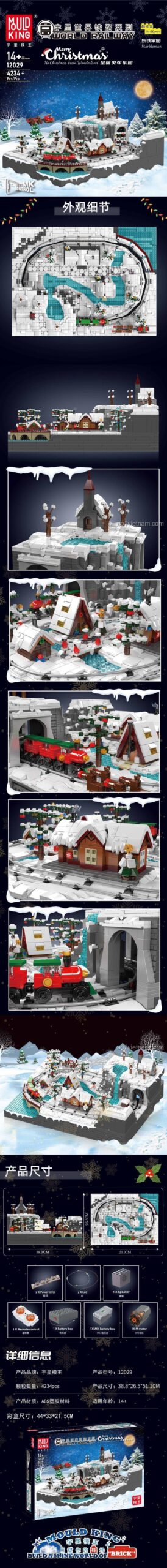 Bộ đồ chơi Xe lửa Giáng Sinh Mould King 12029 là một kiệt tác thiết kế, đưa bạn vào một thế giới thu nhỏ đầy mê hoặc. Mô hình xe lửa Giáng Sinh Mould King này tái hiện một cảnh quan mùa đông tuyệt đẹp với những ngôi nhà nhỏ phủ đầy tuyết trắng, những cây thông xanh mướt được trang trí lấp lánh, và một thác nước đóng băng chảy róc rách. Đoàn tàu Giáng Sinh màu đỏ rực rỡ chạy trên đường ray uốn lượn, xuyên qua một đường hầm bí ẩn, tạo nên một khung cảnh sống động và đầy sức hút.
