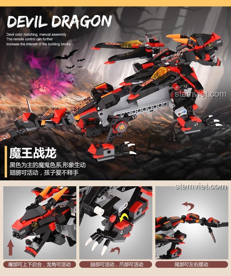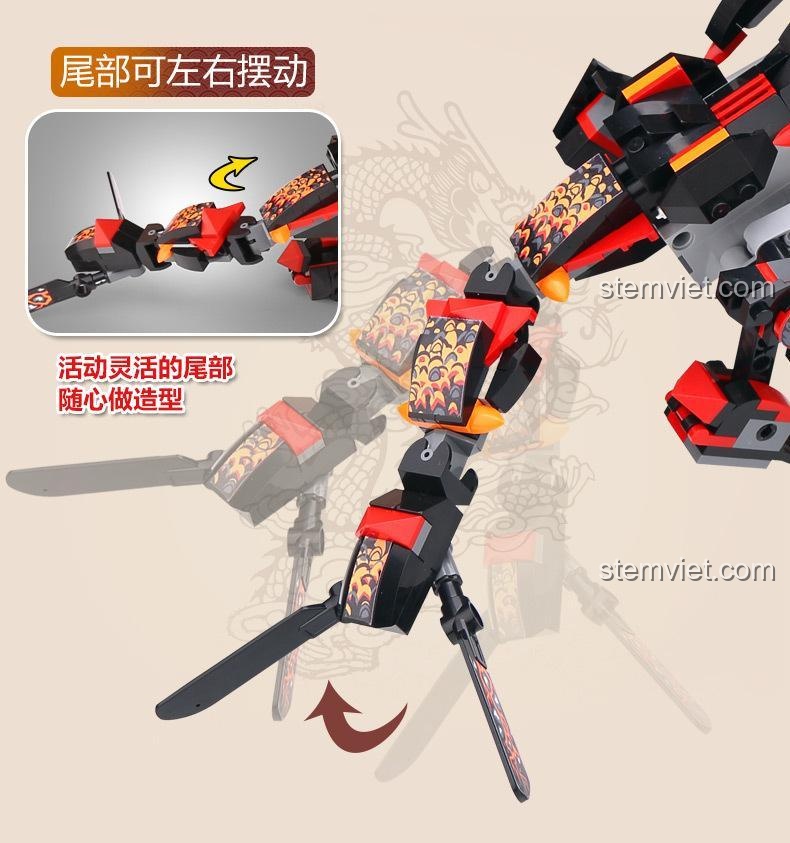 Bên cạnh việc di chuyển tiến, lùi và xoay 360 độ, bộ xếp hình Ma Vương Chiến Long còn có nhiều cử động cơ khí thú vị khác! Bé có thể điều khiển hoặc dùng tay để làm cánh rồng cử động, miệng đóng mở, và đặc biệt là chiếc đuôi dài có thể vẫy qua lại một cách linh hoạt, khiến mô hình trở nên sống động như thật.