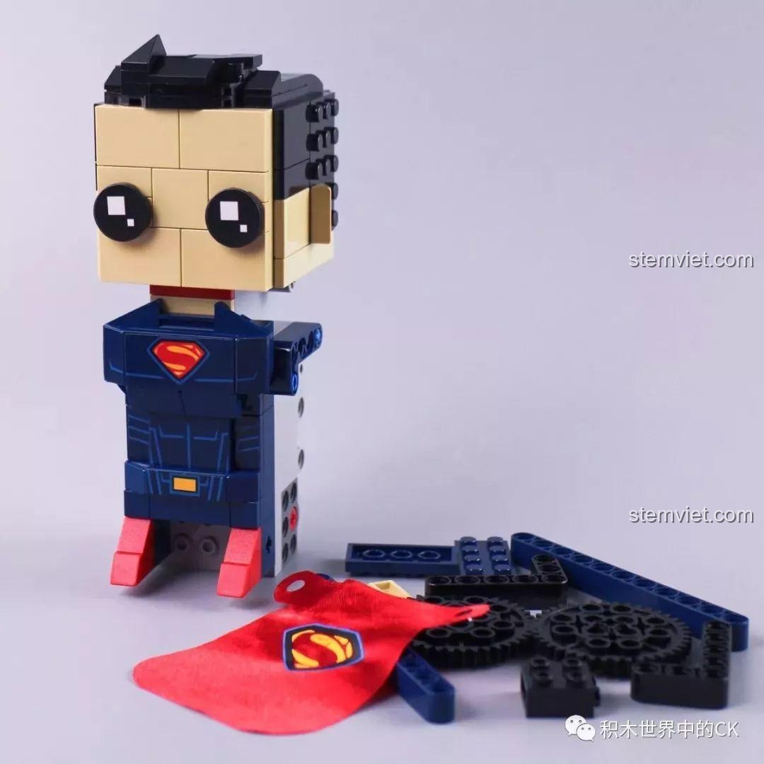 Điểm ấn tượng đầu tiên của bộ đồ chơi lắp ghép 13040 chính là phong cách thiết kế Block-head (đầu khối) cực kỳ ngộ nghĩnh và đáng yêu, một sự phá cách đầy sáng tạo so với hình tượng Siêu Nhân truyền thống. Với chiều cao 15.5 cm, chiều dài 12 cm và chiều rộng 10 cm, mô hình có kích thước vừa vặn, hoàn hảo để trưng bày trên bàn học hoặc để bé cầm nắm và điều khiển. Các màu sắc chủ đạo như Xanh dương, Đỏ, Đen và Kem được phối hợp hài hòa, tái hiện chân thực bộ trang phục biểu tượng của Siêu Nhân, từ logo chữ ‘S’ trên ngực cho đến chiếc áo choàng đỏ bằng vải mềm mại bay phấp phới phía sau. Thay vì đôi chân bình thường, người hùng của chúng ta được trang bị hệ thống bánh xích mạnh mẽ, tạo cảm giác như một cỗ máy công lý sẵn sàng lăn bánh đến bất cứ đâu có kẻ xấu. Từng chi tiết, từ mái tóc đen nhánh đặc trưng đến đôi mắt to tròn, đều được chăm chút tỉ mỉ, tạo nên một tổng thể vừa mạnh mẽ, vừa gần gũi, chắc chắn sẽ khiến các bé trai thích mê.
