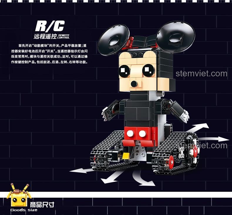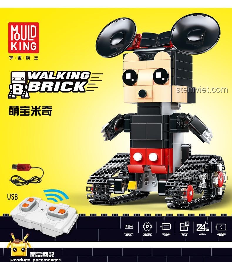Điểm nhấn đắt giá nhất của Robot Chuột Mickey Mould King chính là khả năng điều khiển từ xa. Bộ sản phẩm đi kèm một động cơ mạnh mẽ, pin sạc tiện lợi (kèm cáp sạc USB) và một bộ điều khiển 2.4Ghz nhạy bén. Sau khi lắp ráp xong, bé có thể hóa thân thành “nhà điều khiển” tài ba, ra lệnh cho chú chuột Mickey: