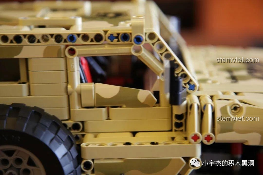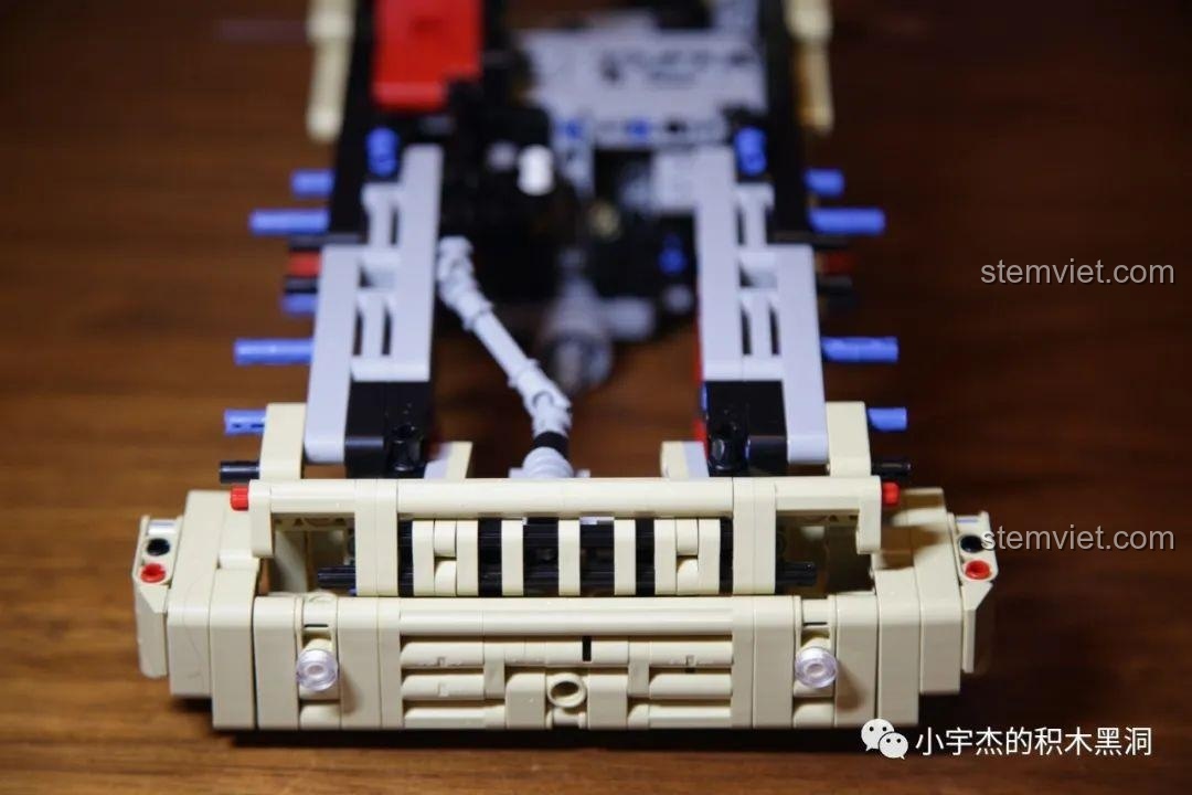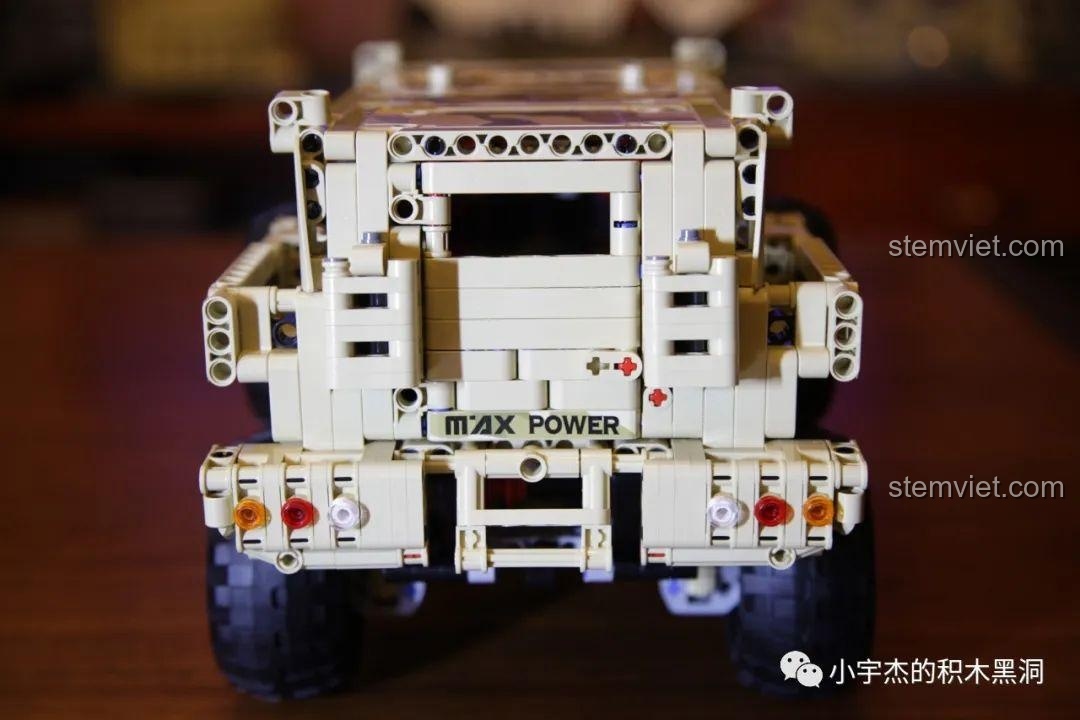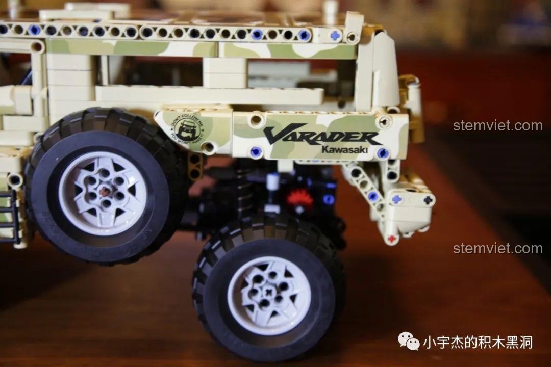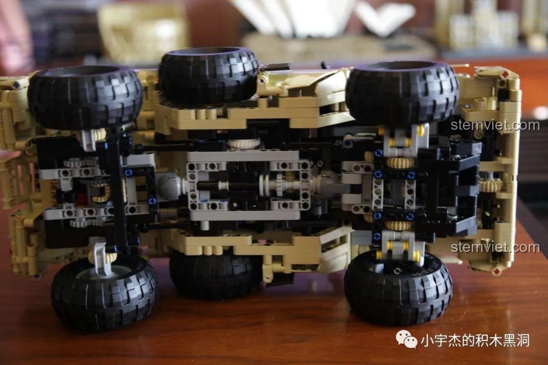 Điểm nhấn đắt giá nhất của Quái thú sa mạc Marauder 13131 phiên bản 13131D chính là khả năng vận hành đầy ấn tượng. Được trang bị bộ động cơ hiệu suất cao và hệ thống điều khiển từ xa qua ứng dụng điện thoại, cỗ máy này không còn là một vật trưng bày vô tri. Bạn có thể điều khiển nó tiến, lùi, rẽ trái, rẽ phải một cách linh hoạt. Sức mạnh thực sự của nó nằm ở hệ thống dẫn động 4 bánh (4WD) kết hợp với hệ thống treo độc lập trên cả bốn bánh xe. Mỗi bánh xe đều được trang bị giảm xóc riêng, bao gồm cả giảm xóc kép ở phía trước và giảm xóc lò xo lớn ở phía sau, cho phép chiếc xe vượt qua các địa hình gồ ghề một cách dễ dàng, mô phỏng hoàn hảo khả năng off-road của nguyên mẫu. Việc lắp ráp và chứng kiến hệ thống truyền động, vi sai, và hệ thống treo hoạt động nhịp nhàng là một trải nghiệm giáo dục và vô cùng thỏa mãn cho bất kỳ ai yêu thích kỹ thuật.