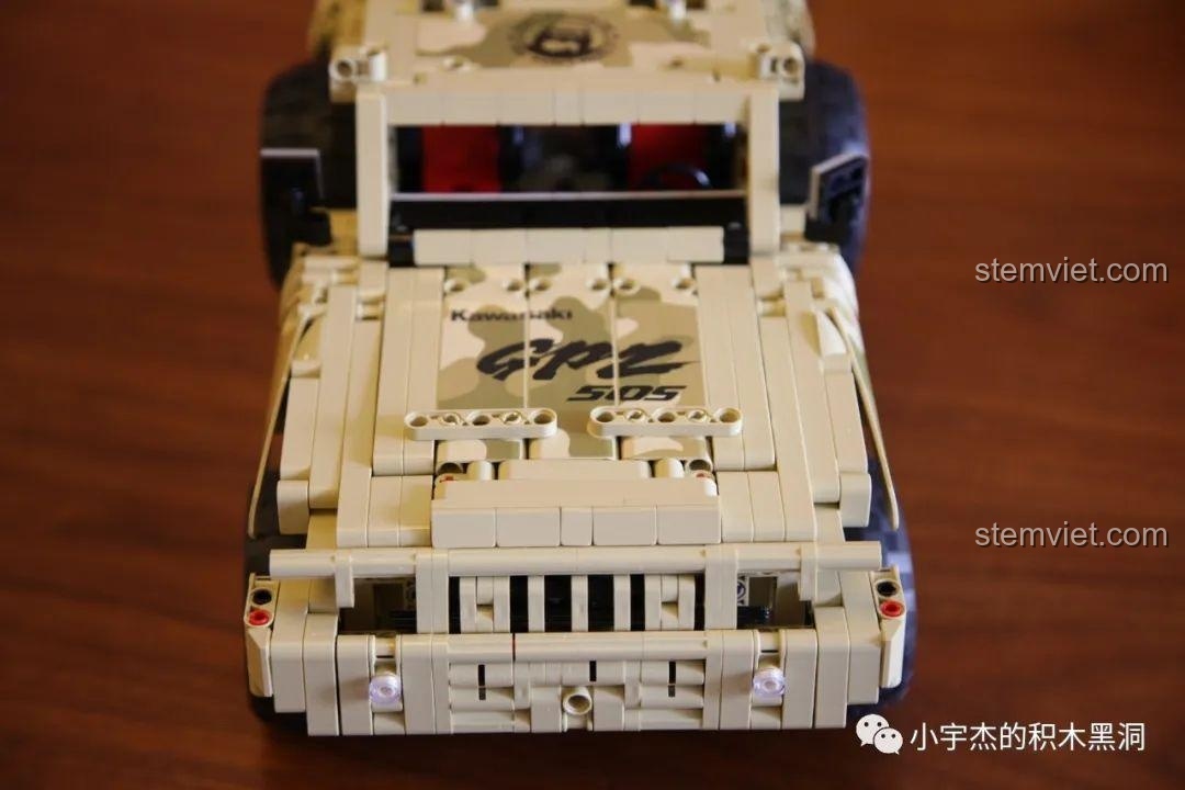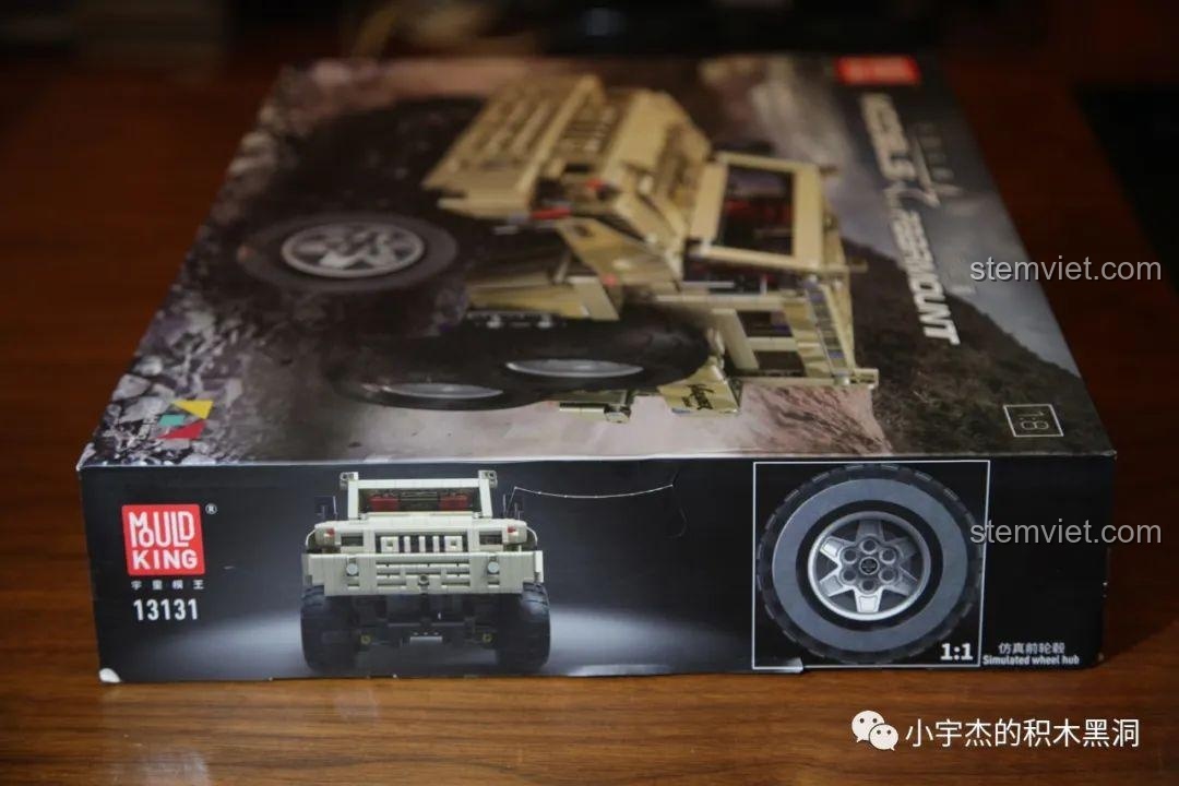 Ngay từ cái nhìn đầu tiên, đồ chơi mô hình Mould King 13131D đã gây ấn tượng mạnh mẽ với vẻ ngoài hầm hố, góc cạnh và tông màu vàng cát sa mạc chủ đạo, điểm xuyết bởi các họa tiết rằn ri quân sự độc đáo. Mọi chi tiết đều được chăm chút tỉ mỉ để tái hiện một cách chân thực nhất nguyên mẫu Paramount Marauder. Từ lưới tản nhiệt phía trước đầy uy lực, bộ lốp địa hình khổng lồ với gai lốp sâu, cho đến hệ thống khung gầm phức tạp, tất cả đều toát lên vẻ mạnh mẽ, sẵn sàng chinh phục mọi thử thách. Các cánh cửa, nắp capo và cửa sau đều có thể mở ra, để lộ khoang nội thất và khoang động cơ được mô phỏng chi tiết. Dù trên vỏ hộp ghi tỉ lệ 1:8, thực tế mô hình có kích thước nhỏ gọn hơn một chút, nhưng điều đó không làm giảm đi sự hoành tráng và độ chi tiết đáng kinh ngạc của nó. Đây thực sự là một tác phẩm nghệ thuật cơ khí, một điểm nhấn đầy tự hào trong bất kỳ bộ sưu tập nào.