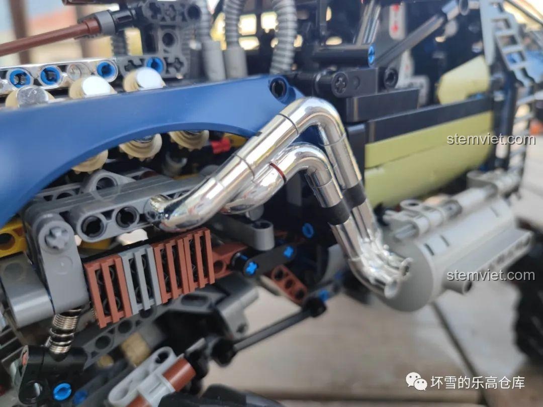 Điểm nhấn nổi bật trong thiết kế phải kể đến khối động cơ V16 lộ thiên ở phía trước, với các chi tiết mạ crom sáng bóng, mang lại vẻ ngoài hầm hố và đầy uy lực. Hệ thống ống xả lớn, cũng được mạ crom, càng tăng thêm vẻ “quái vật” cho chiếc xe. Phía sau là cần cẩu kéo với thiết kế chắc chắn, có thể nâng hạ linh hoạt, mô phỏng chức năng cứu hộ hoặc vận chuyển trong điều kiện khắc nghiệt. Bốn bánh xe lớn với lốp gai hầm hố không chỉ tăng tính thẩm mỹ mà còn đảm bảo khả năng bám đường vượt trội trên mọi địa hình. Mỗi mảnh ghép đều được gia công tỉ mỉ, đảm bảo độ khớp nối hoàn hảo, tạo nên một mô hình đồ chơi mô hình Xe Tải Kéo Hậu Tận Thế vững chắc và chi tiết cao. Đây chắc chắn là một món đồ chơi lắp ráp đáng giá, mang lại trải nghiệm thị giác mãn nhãn và khơi gợi trí tưởng tượng không giới hạn.