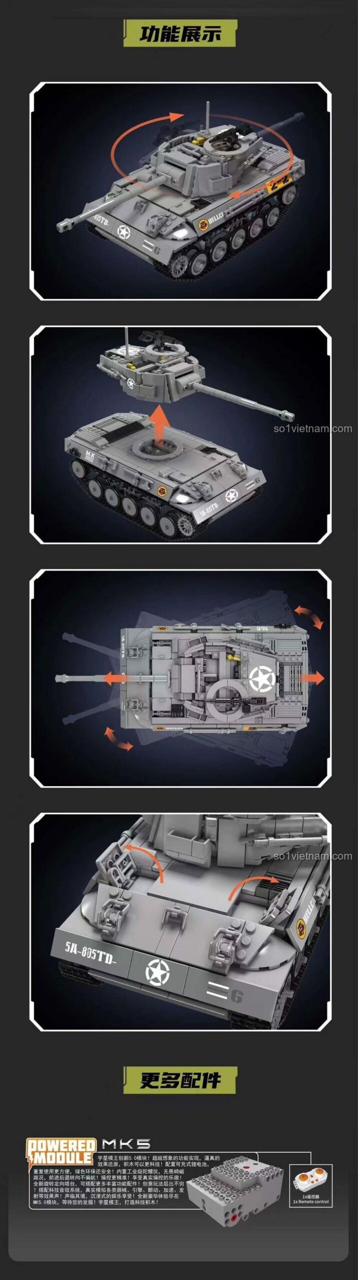 • Bánh xích chuyển động: Hệ thống bánh xích được thiết kế chi tiết, cho phép xe di chuyển trên nhiều địa hình khác nhau, mô phỏng hoạt động của xe tăng thật.