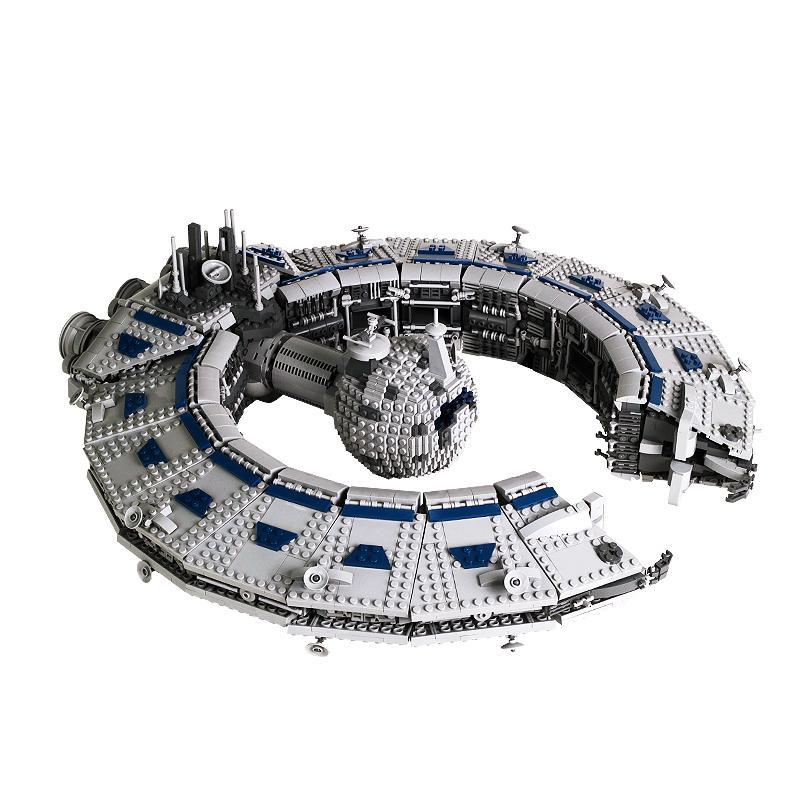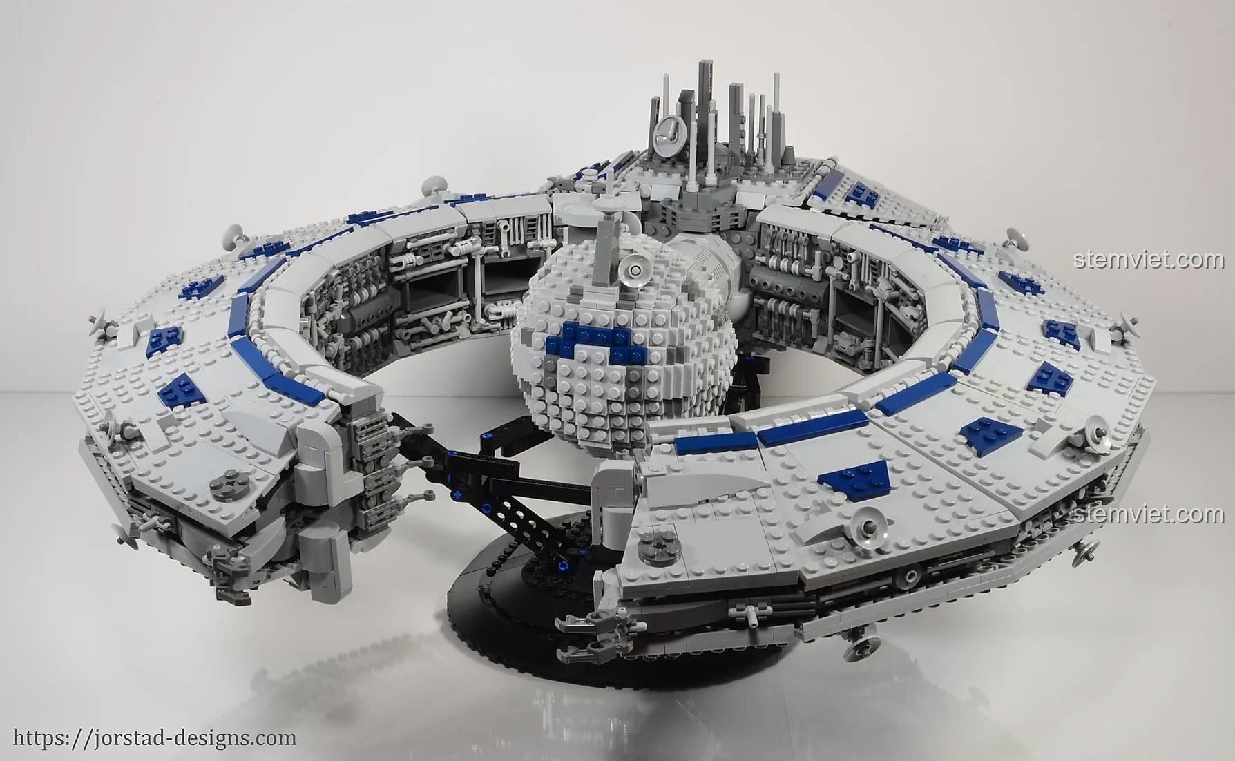 Điều làm nên sự khác biệt của đồ chơi mô hình Mould King 21008 chính là thiết kế chuẩn UCS (Ultimate Collector Series) vô cùng ấn tượng. Với kích thước sau khi hoàn thành lên tới 54cm chiều dài, 48cm chiều rộng và 17cm chiều cao, đây thực sự là một mô hình trưng bày khổng lồ, uy lực. Toàn bộ con tàu được phủ lên mình màu xám và xanh dương đặc trưng, điểm xuyết bằng các chi tiết màu đen, tái hiện chính xác nguyên mẫu trong phim. Từ khối cầu chỉ huy trung tâm được thiết kế tỉ mỉ, đến vòng ngoài hình chữ C khổng lồ với các chi tiết động cơ, tháp pháo, và hệ thống phòng thủ, tất cả đều được chăm chút để tạo nên một tổng thể hoàn hảo. Mỗi mảnh ghép đều là một phần của một kiệt tác, mang đến một vẻ đẹp vừa hùng vĩ, vừa tinh xảo, chắc chắn sẽ làm say lòng bất kỳ ai chiêm ngưỡng.