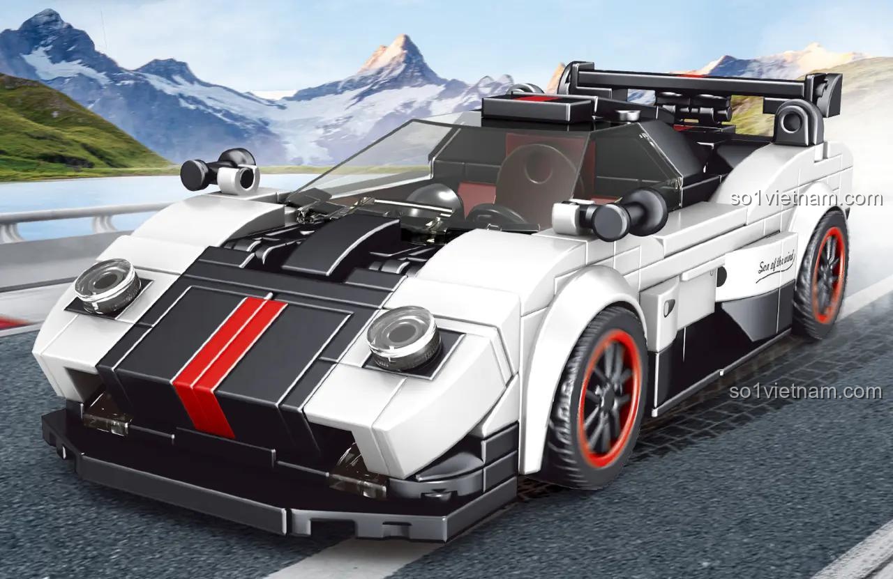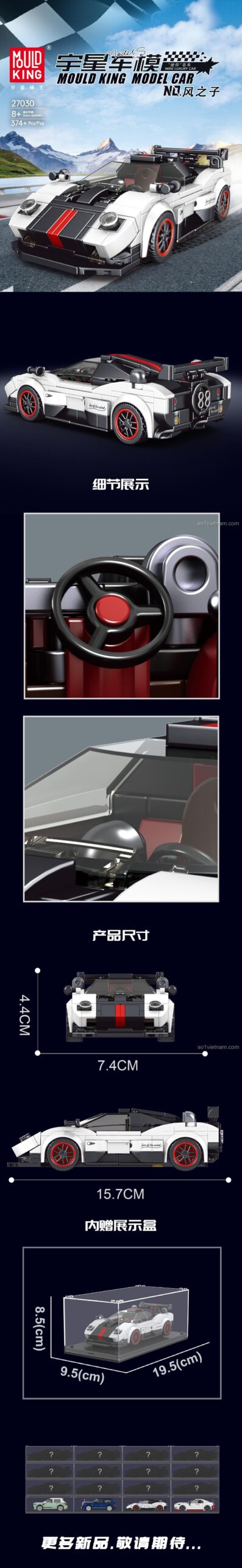 Mould King 27030 Siêu xe Pagani Zonda F “Phong Chi Tử” gây ấn tượng mạnh mẽ với thiết kế chân thực đến từng chi tiết, mô phỏng gần như hoàn hảo phiên bản đời thực. Với 374 mảnh ghép, bạn sẽ được trải nghiệm quá trình lắp ráp tỉ mỉ, từ khung gầm chắc chắn đến thân xe khí động học. Màu trắng chủ đạo, điểm xuyết bởi sọc đỏ và đen táo bạo, cùng bộ mâm xe thể thao màu đỏ, tạo nên một diện mạo vô cùng cuốn hút và sang trọng. Kích thước mô hình sau khi hoàn thành (15.7 x 7.4 x 4.4 cm) vừa vặn để trưng bày trên bàn làm việc, kệ sách hay bất kỳ không gian nào, thu hút mọi ánh nhìn. Tỉ lệ mô hình được ước tính khoảng 1:16, mang lại cảm giác chân thực và ấn tượng.