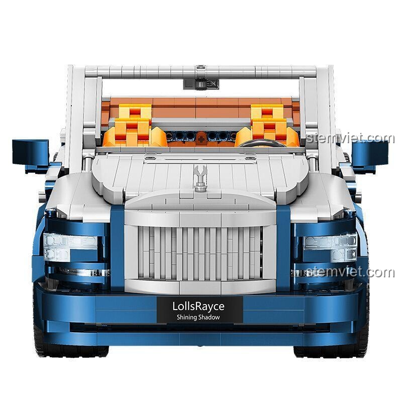 Ngay từ cái nhìn đầu tiên, đồ chơi mô hình MOYU BLOCK 88003 đã chinh phục mọi ánh nhìn bằng vẻ ngoài lộng lẫy và kích thước hoành tráng. Với chiều dài lên tới 55cm theo tỉ lệ 1:8, chiếc xe thực sự là một gã khổng lồ trong thế giới mô hình. Lớp sơn màu xanh dương đậm kết hợp với màu bạc ở nắp capo và mui xe tạo nên một tổng thể hài hòa, sang trọng. Điểm nhấn không thể bỏ qua là bộ nội thất màu cam rực rỡ, mô phỏng chất liệu da cao cấp, mang lại cảm giác xa hoa tột đỉnh. Đặc biệt, thiết kế cửa mở ngược (suicide door) đặc trưng của dòng xe siêu sang đã được tái hiện một cách hoàn hảo, mang lại trải nghiệm chân thực và đầy phấn khích. Từng chi tiết, từ lưới tản nhiệt mạ chrome, logo ‘LollsRayce’ tinh tế, cho đến bộ vành bánh xe phức tạp, tất cả đều được chăm chút tỉ mỉ, tạo nên một tác phẩm nghệ thuật thực sự.