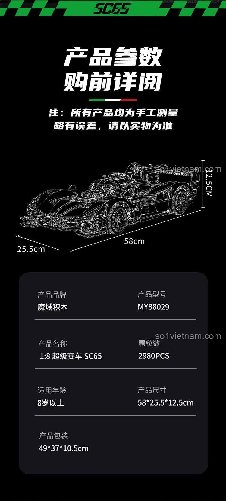 Siêu Xe Đua SC65 của MOYU BLOCK là một tuyệt tác về thiết kế, nơi mỗi đường cong, mỗi chi tiết đều toát lên vẻ đẹp mạnh mẽ và đầy cuốn hút của một chiếc siêu xe thể thao đích thực. Với tỉ lệ 1:8, mô hình này sở hữu kích thước ấn tượng (58 x 25.5 x 12.5 cm), đủ lớn để bạn chiêm ngưỡng trọn vẹn từng đường nét tinh xảo.