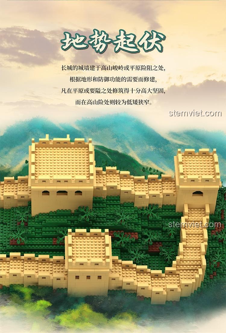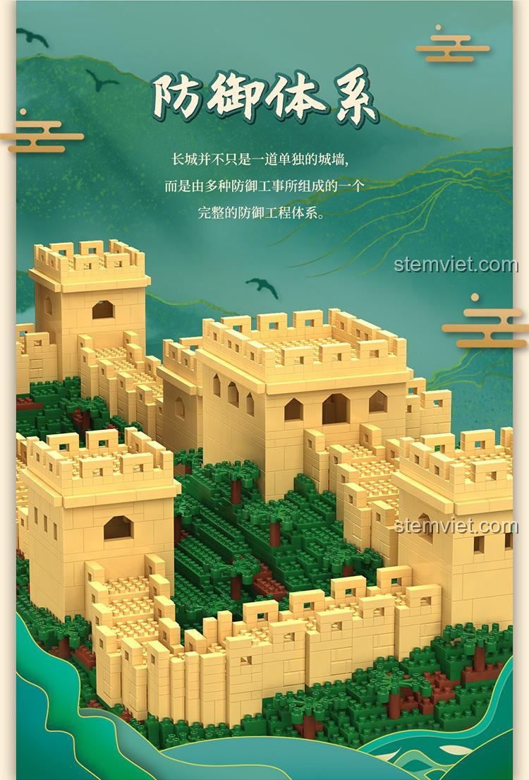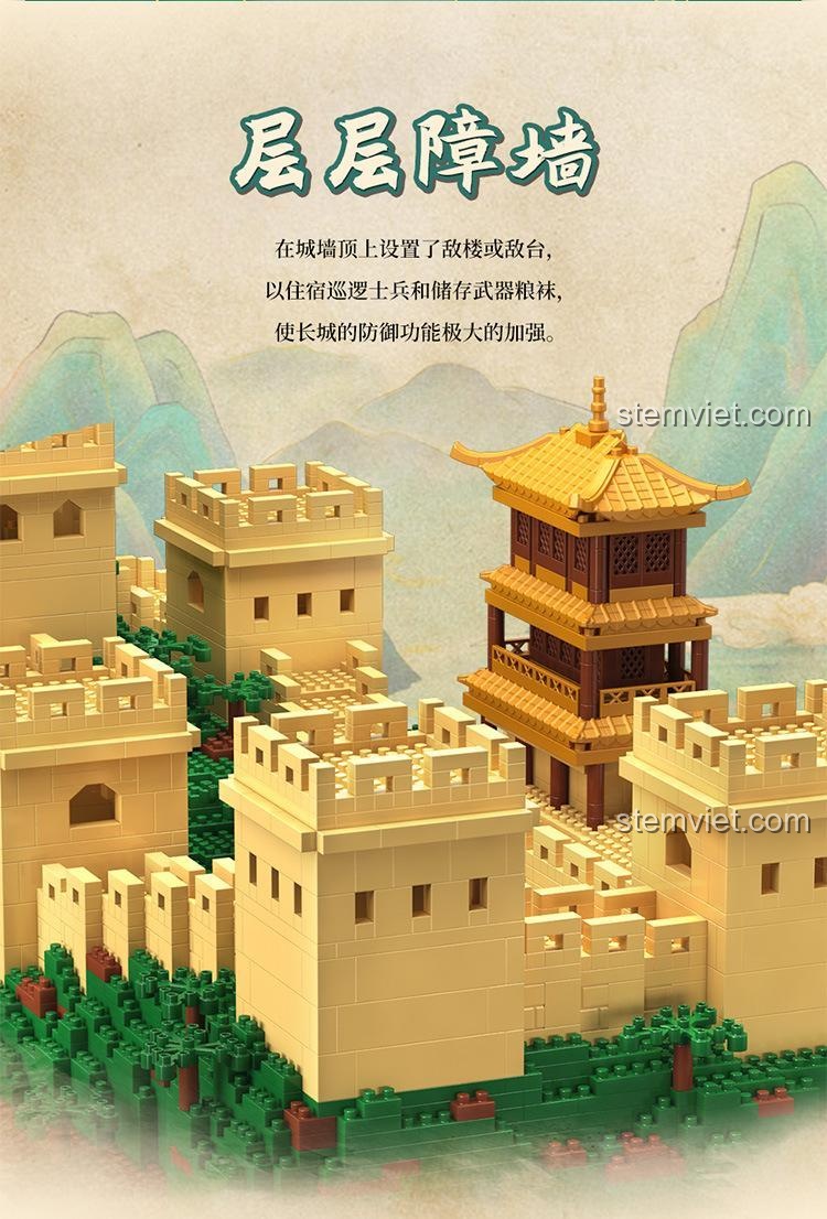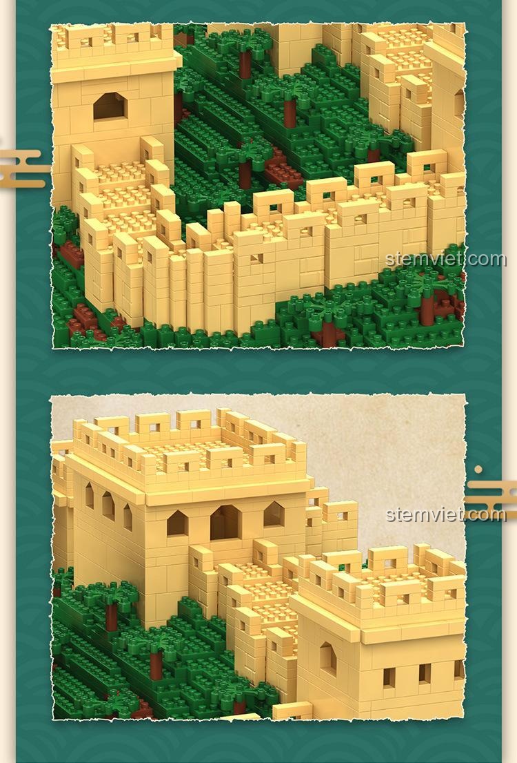 Từng mảnh ghép nhỏ được chế tác tinh xảo, giúp bé dễ dàng hình dung cấu trúc phòng thủ phức tạp của Trường Thành, từ những tháp canh kiên cố, tường thành uốn lượn theo địa hình, đến những cổng thành uy nghi. Đây thực sự là một đồ chơi xây dựng Mô hình Trường Thành giúp bé phát triển khả năng quan sát và cảm nhận thẩm mỹ, đồng thời hiểu hơn về giá trị lịch sử và văn hóa.