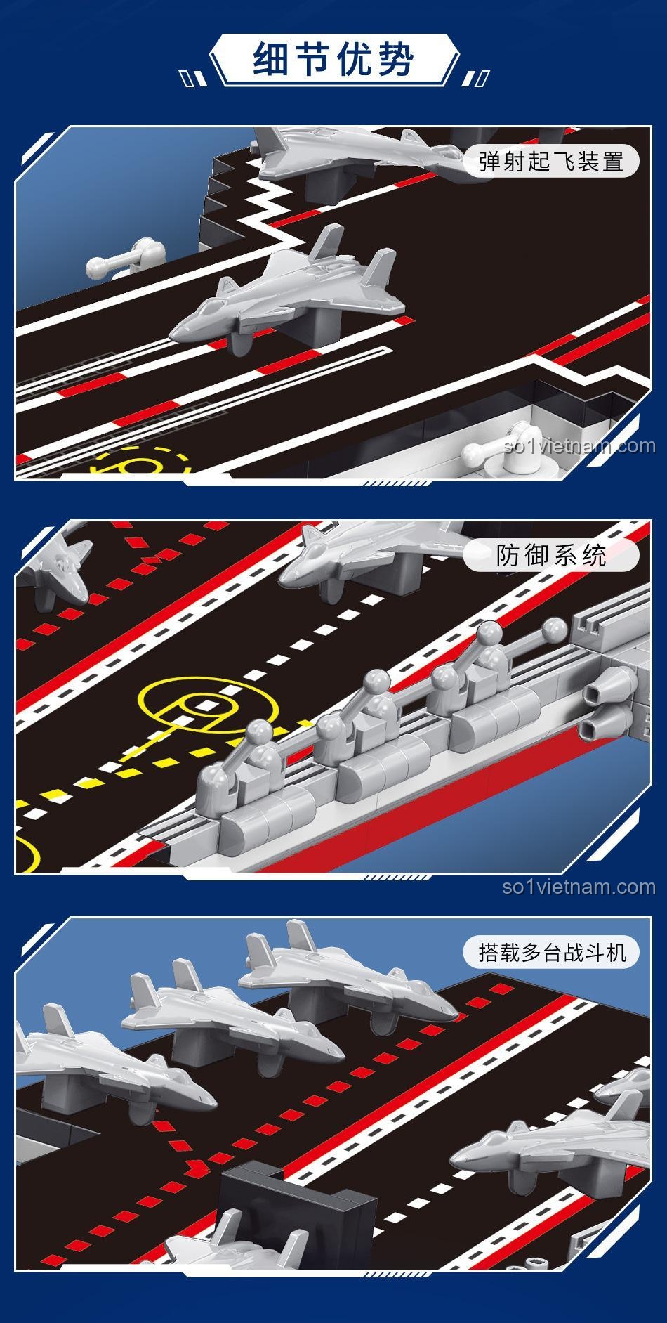 • Hệ thống phóng máy bay: Mô hình mô phỏng cơ cấu phóng máy bay, cho phép bé tương tác và tưởng tượng ra cảnh những chiếc tiêm kích lao vút lên bầu trời từ đường băng.