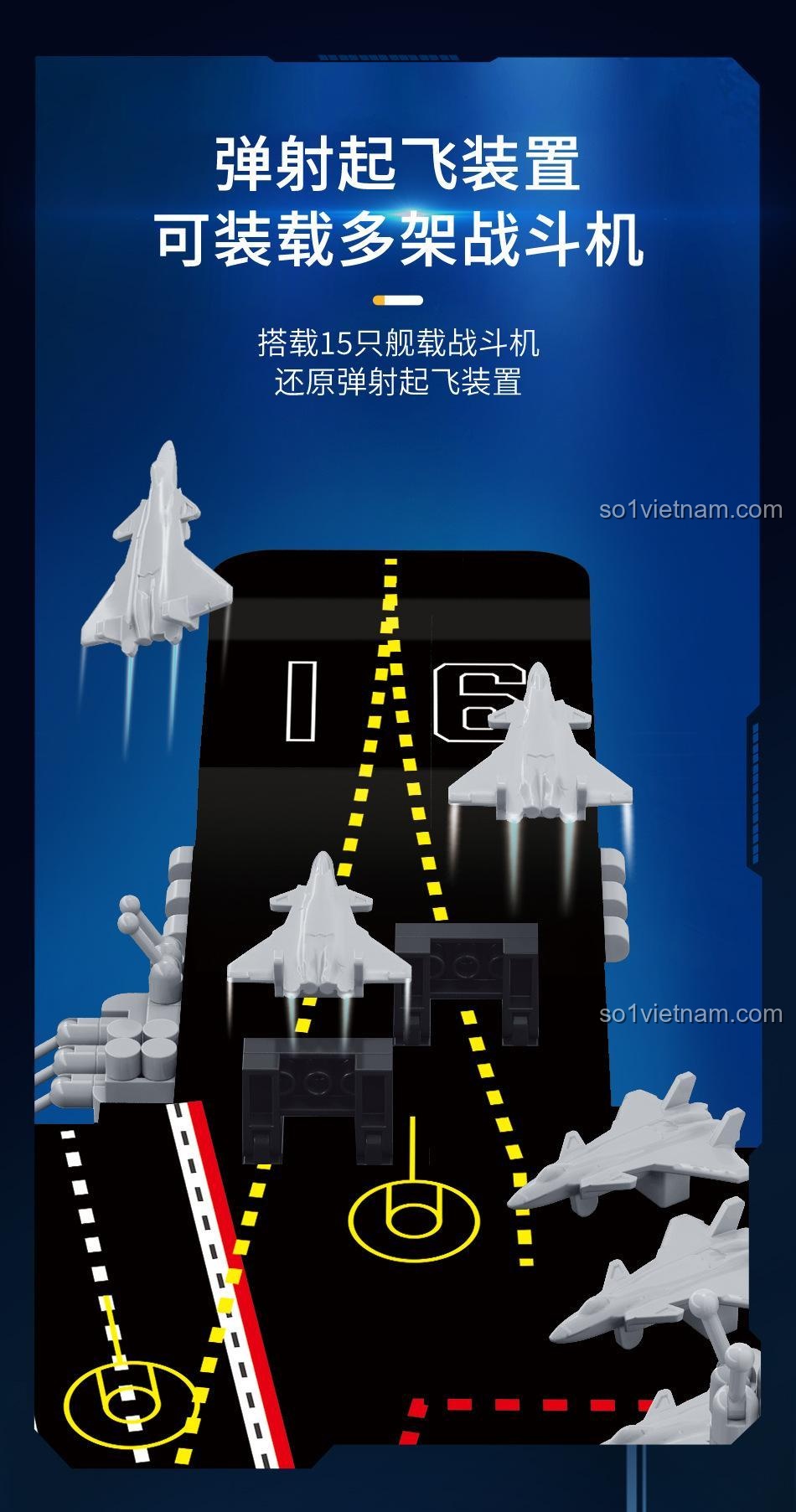 • Hạm đội bay hùng hậu: Sản phẩm đi kèm đến 15 mô hình máy bay chiến đấu mini. Bé có thể sắp xếp chúng trên boong tàu, chuẩn bị cho các phi vụ cất cánh hoặc hạ cánh, tái hiện lại hoạt động tấp nập của một tàu sân bay thực thụ.