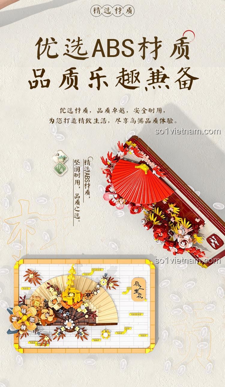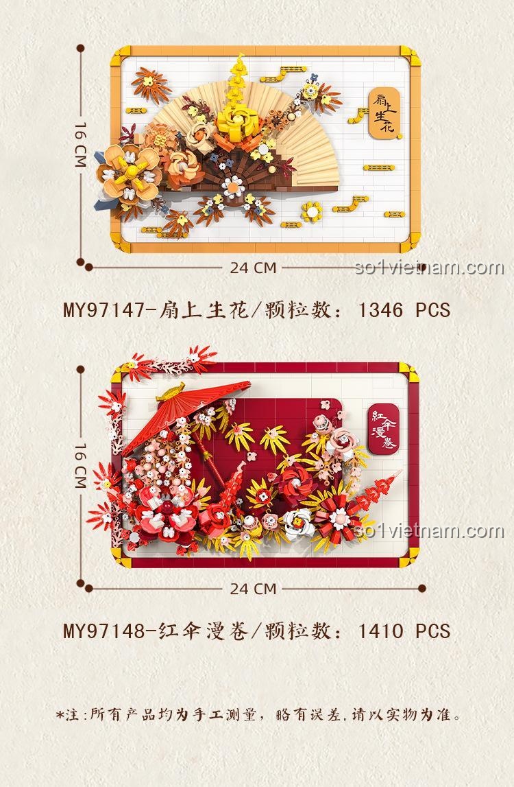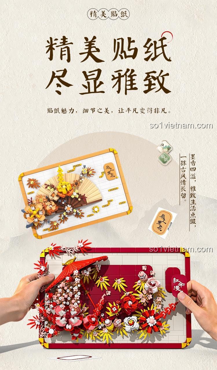 Bộ lắp ghép MOYU BLOCK MY97147 Tranh Cuộn 3D Phong Cách Trung Hoa: Hoa Nở Trên Quạt là một minh chứng cho sự tinh xảo trong thiết kế. Với kích thước mô hình hoàn thiện là 24 cm chiều dài, 16 cm chiều rộng và 7.5 cm chiều cao, tác phẩm này đủ lớn để tạo ấn tượng nhưng vẫn gọn gàng để trưng bày. Màu sắc chủ đạo là Đỏ, Vàng, Trắng và Nâu, được phối hợp hài hòa, tạo nên một bức tranh 3D sống động, rực rỡ nhưng vẫn giữ được nét cổ kính, trang nhã.