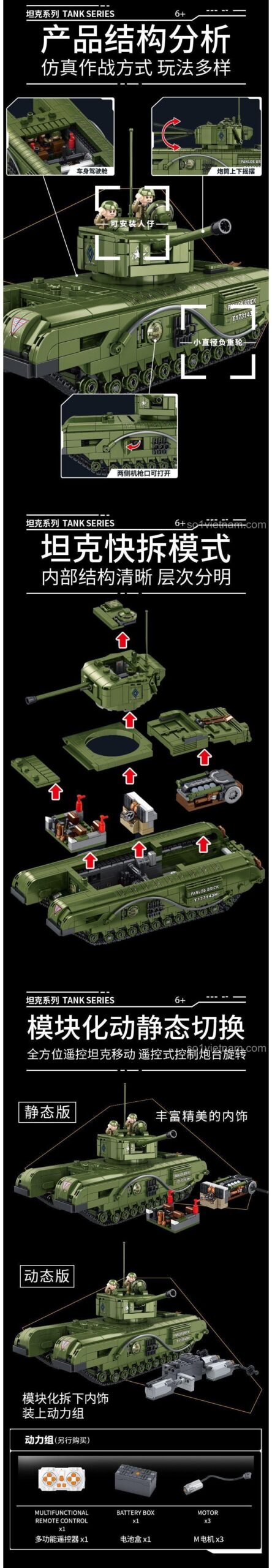 Bộ lắp ráp này được thiết kế để có thể nâng cấp chức năng động cơ và điều khiển từ xa. Bạn cần mua thêm bộ động cơ và điều khiển riêng để biến nó thành xe tăng RC.
